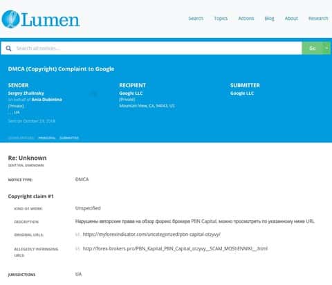 Мошенники ПБН Капитал (ПБН Маркетс) начали активную борьбу с данной статьей через DMCA