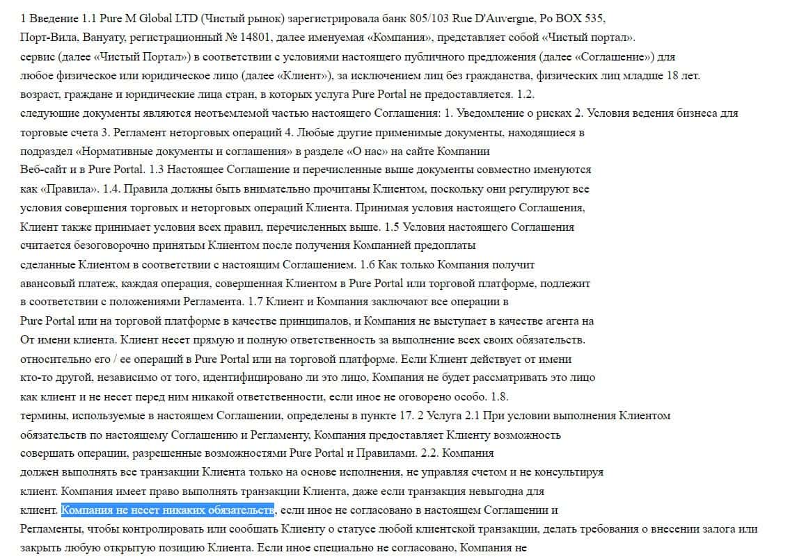 Очередная ловушка в клиентском договоре брокерской кухни Пуре Маркет была найдена мною, и вы также можете ознакомится с ней на скриншоте ниже.