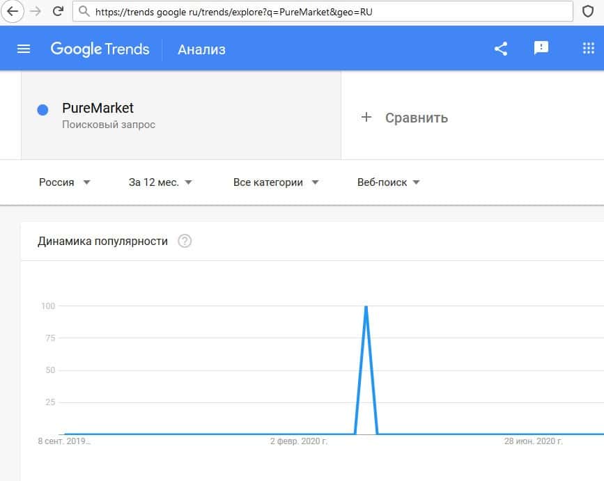 Английское наименование конторы "PureMarket" искали чаще - не менее 20 раз в месяц.