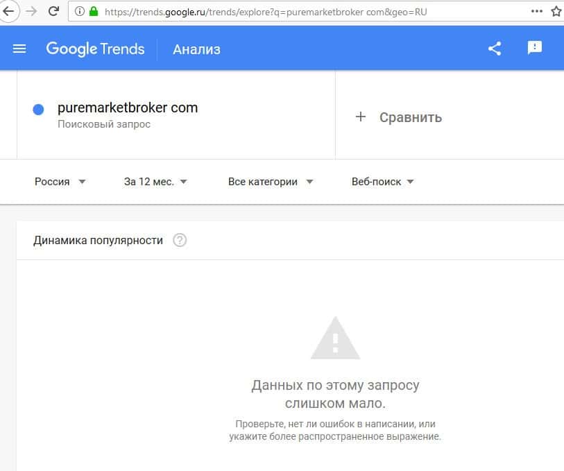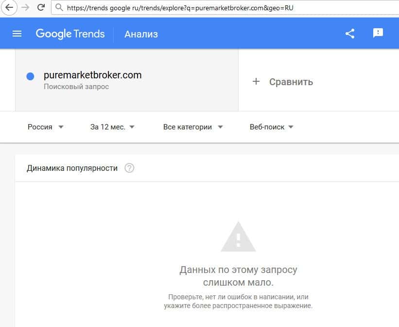 Полное имя домена "puremarketbroker.com" с точкой пользователи Гугла тоже не спешат набирать.