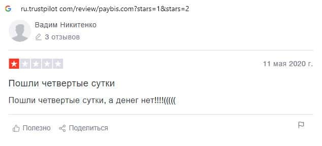 Далее предоставлен пользовательский отзыв о том, что шулера Пэй Бис не выводят средства на протяжении четвертых суток и навряд-ли вернут что-либо.