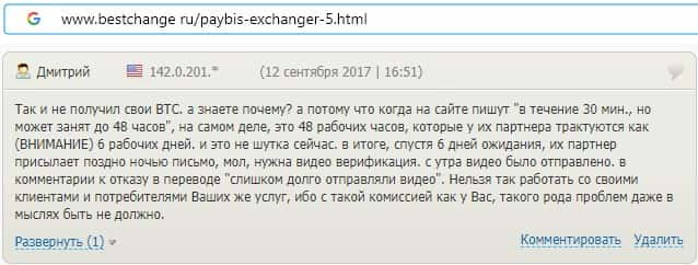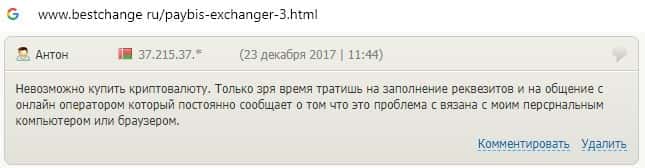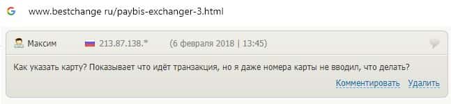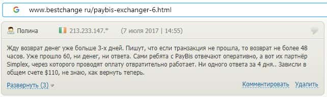 Пользователь пишет, что служба технической поддержки скам-конторы PayBis не отвечает по какой причине он не прошел обмен.