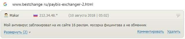 Автор данного отзыва пишет, что при открытии сайта Пэй Бис сработал антивирус и заблокировал 16 реклам имеющихся на сайте данной шараги.