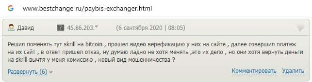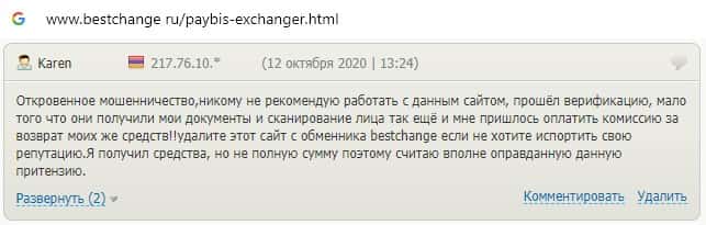 Аферисты Пэй Бис не вывели средства клиенту, забрав себе комиссию с данных средств, что является признаком мошеннического обменника.