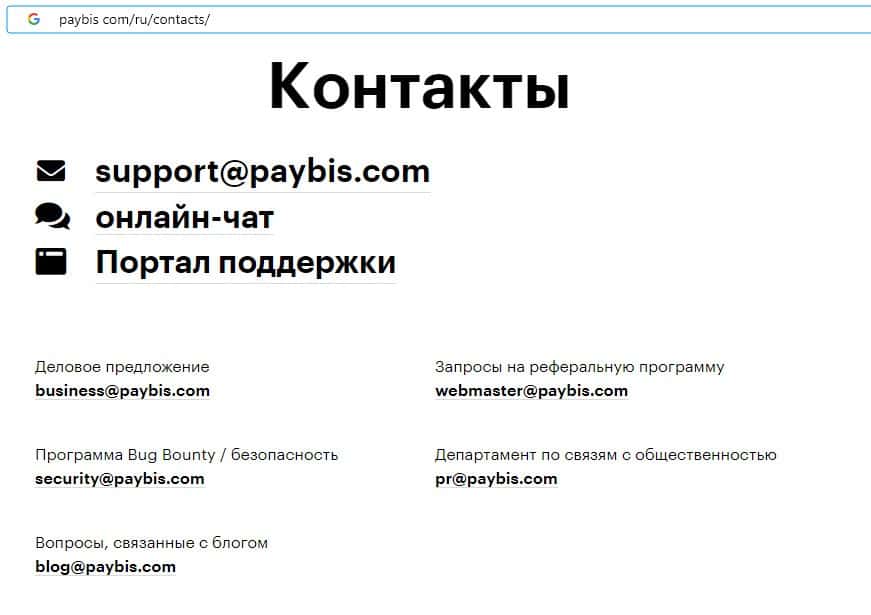 Аферисты PayBis на своем официальном интернет-портале указывают перечень адресов электронной почты, а именно: