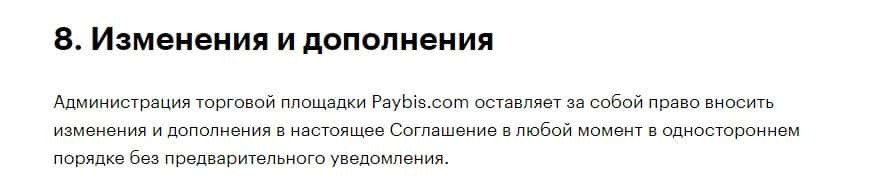 Скам-компания Пэй Бис вправе изменить любой из пунктов клиентского соглашения, за своевременное ознакомление клиента с которым ответственности не несет.
