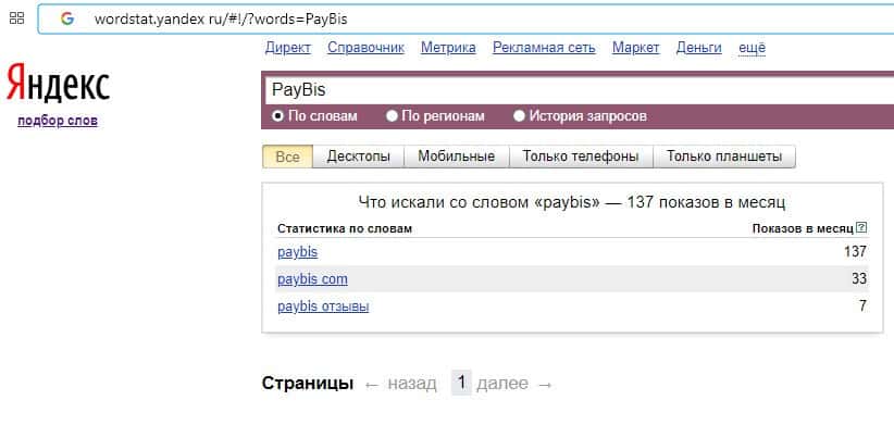 Количество брендовых запросов англоязычного названия компании "PayBis" на Вордстарт Яндекс Ру составляет 137 запросов за месяц.
