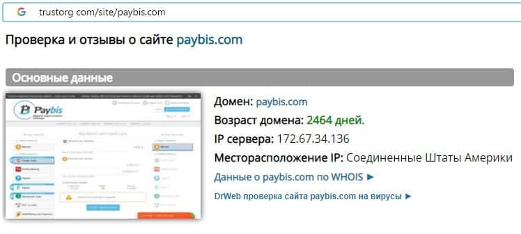 Проверка онлайн-сервиса аферистов PayBis на trustorg com показала, что возраст домена к моменту написания статьи составляет 2464 дня, вероятнее всего домен купленный.