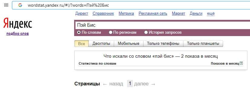 Количество брендовых запросов названия компании на русском языке "Пэй Бис" на Яндекс Вордстарт составляет 2 показа за месяц.