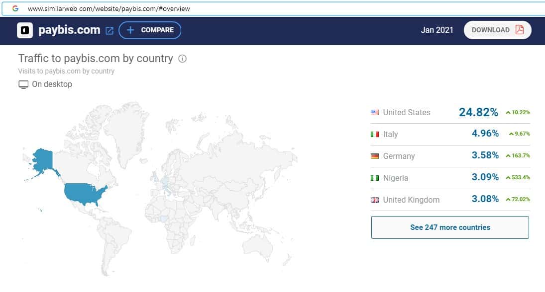 При проверке посещаемости интернет-ресурса мошеннической организации Пэй Бис на similarweb com оказалось, что среди трафика есть пользователи из США, Италии и Германии.