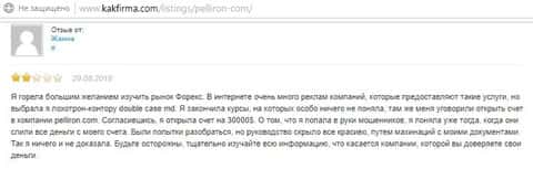 Женщина случайно попала на сайт брокерской конторы Pelliron, когда было в поисках надежного брокера. Но звонари из этой конторы выдали себя своей безграмотностью и не компетенцией в различных вопросах, что не захотелось с этими неучами работать. Они предлагали девушке пройти обучение, которое не очень раскрывает полностью суть трейдинга как профессии, поэтому пришлось им расстаться. Плюс ко всему звонари-менеджеры кухни Пеллирон настолько настойчиво упрашивали ее открыть счет и положить туда деньги, что прямо указывало на потенциально воровские действия, которые пахли очередной конторой по разводу.