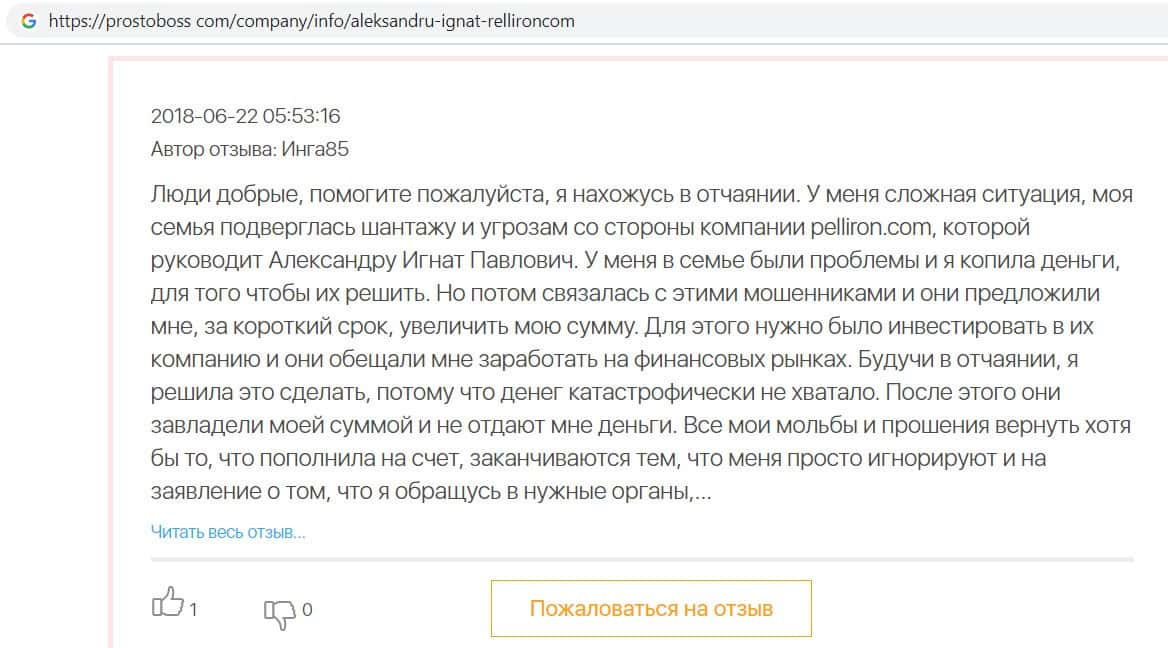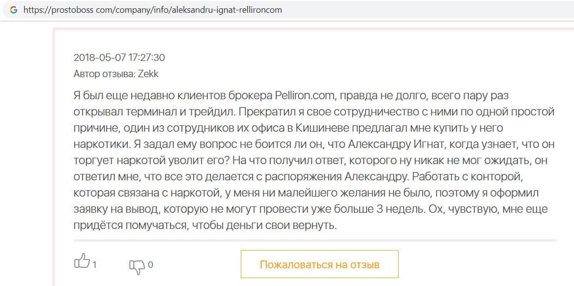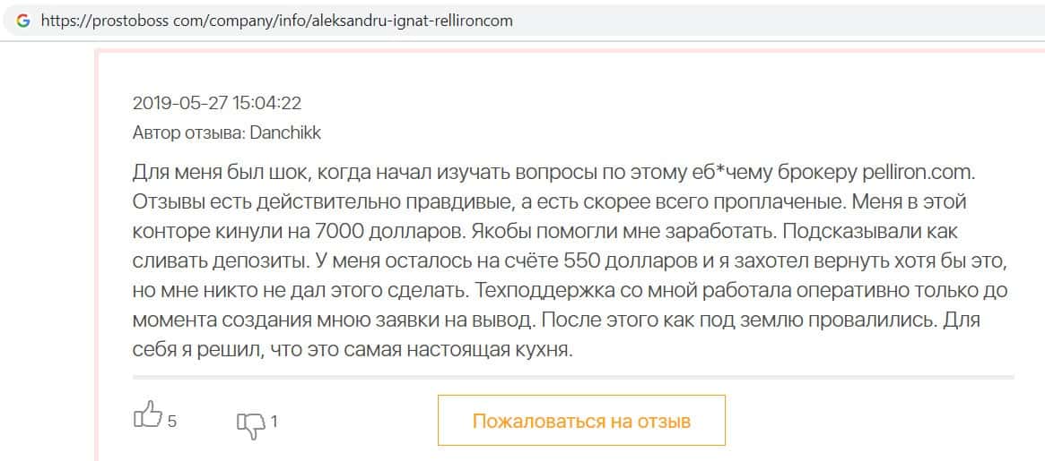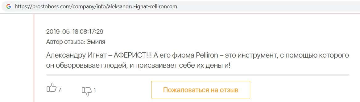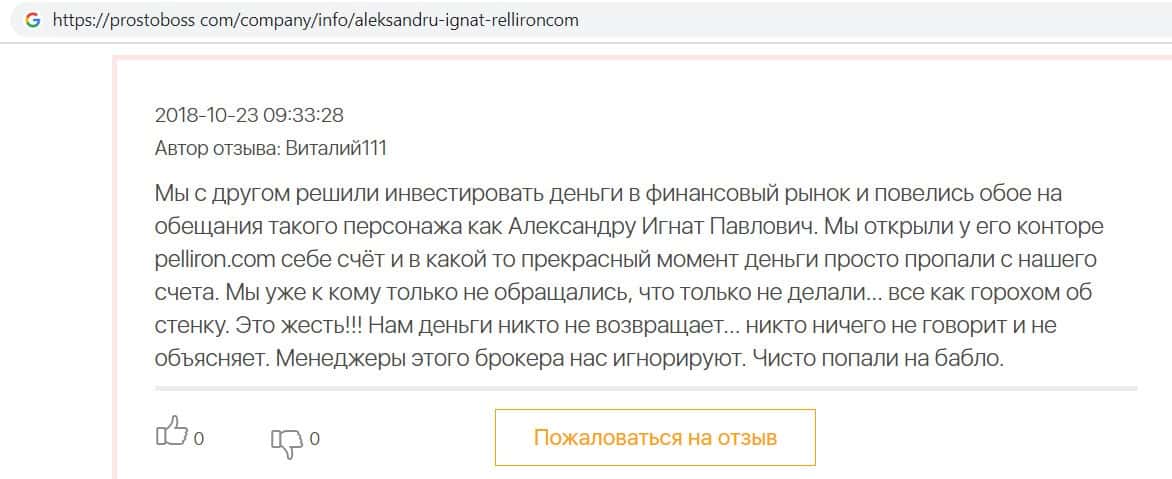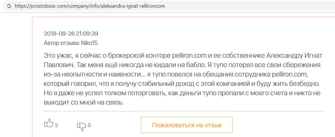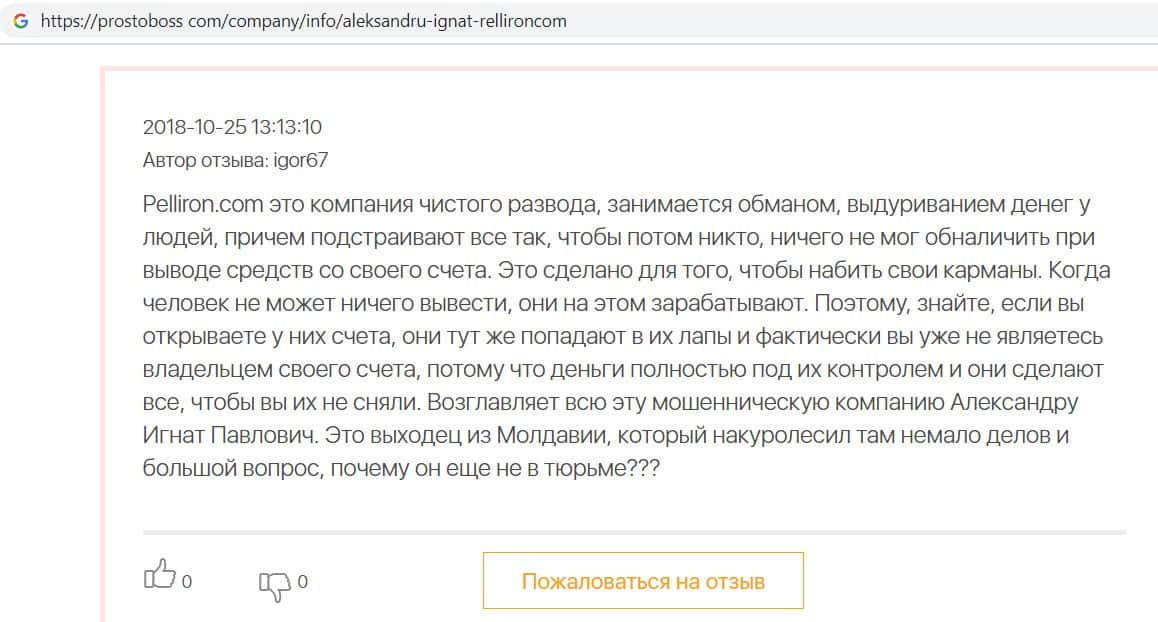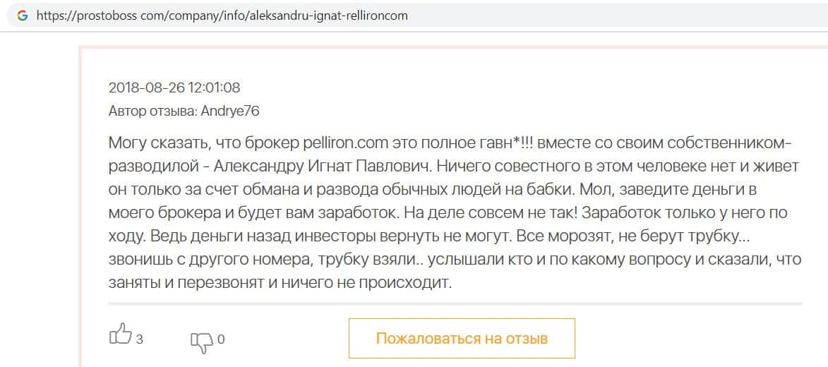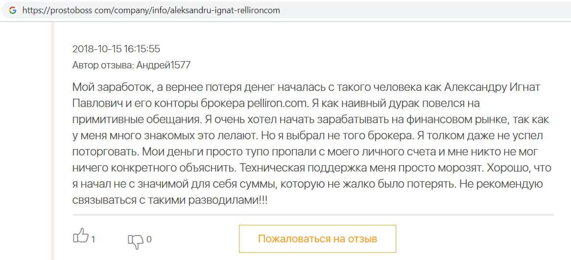 Автор данного отзыва попался на удочку аферистов брокерской организации Pelliron и закинул туда 10 000 долларов. К нему втерся в доверие главный аферист Александру Игнат, который убедил его в надежности вклада. Человек долго копил эти деньги, для него это теперь большая утрата. Он пытался вернуть деньги, но аферисты избегают кинутого клиента и получают удовольствие, когда страдают другие.