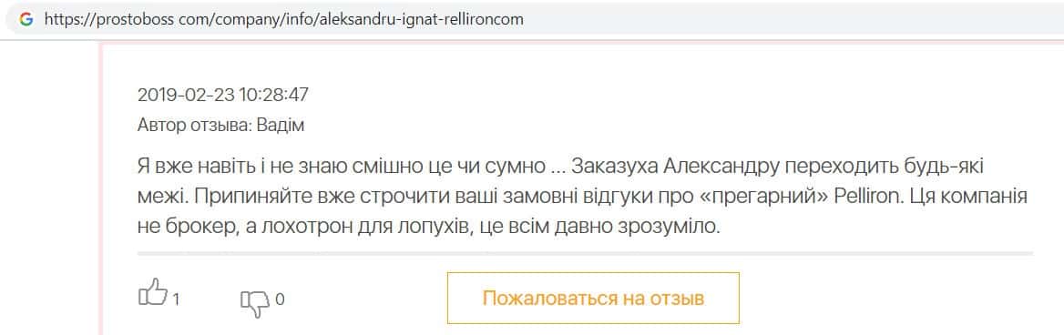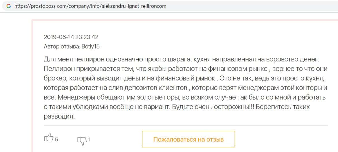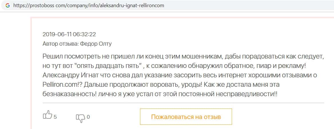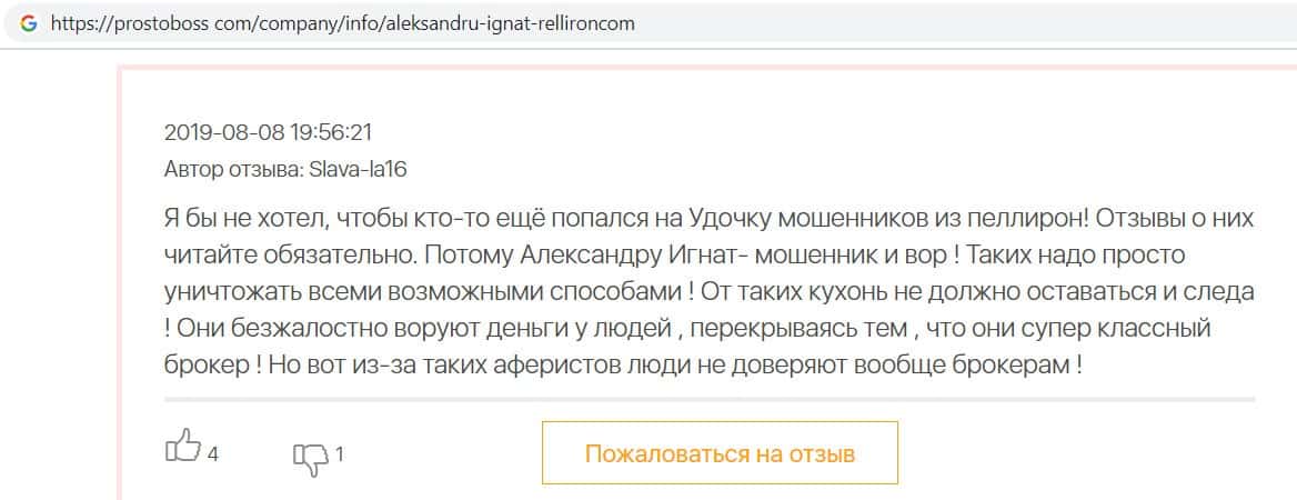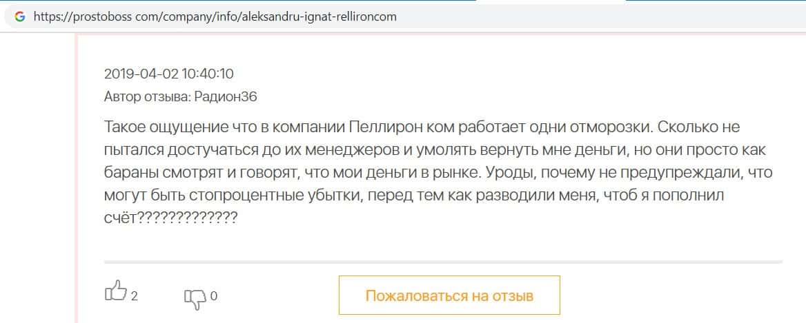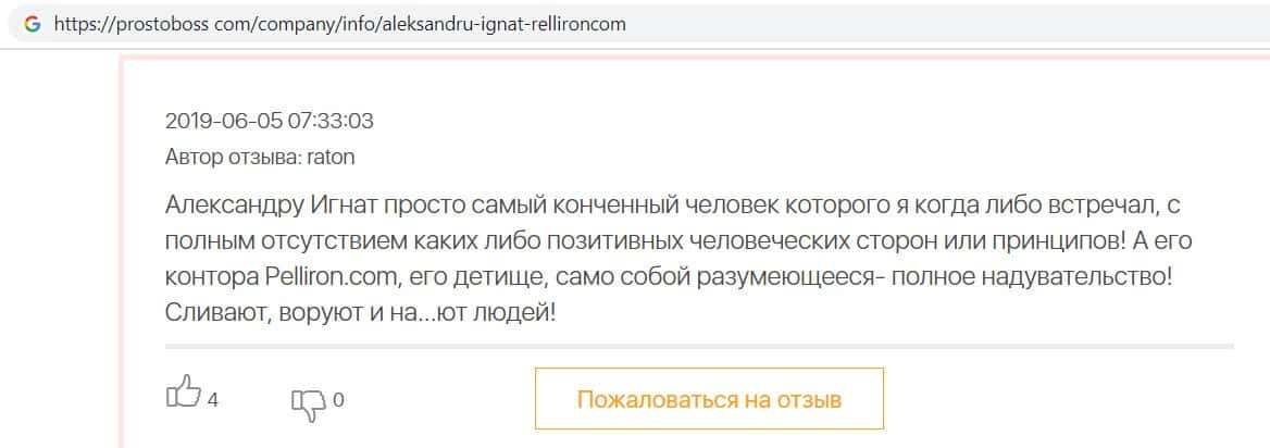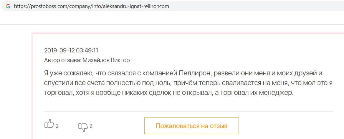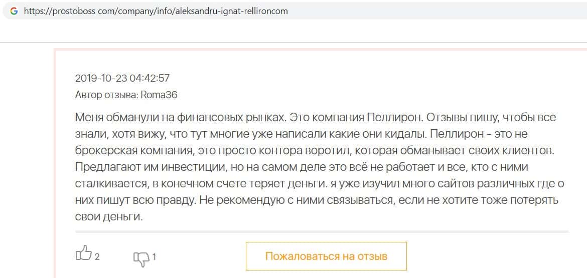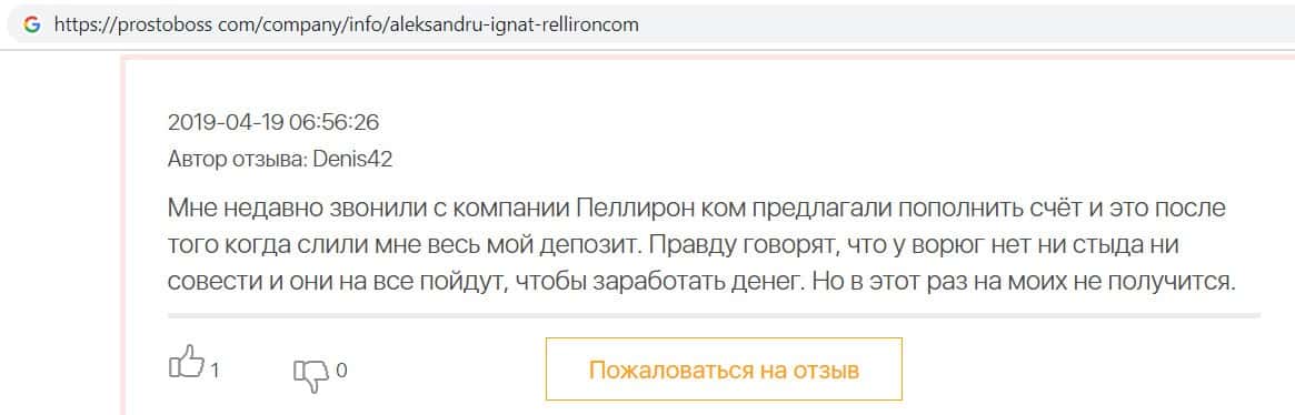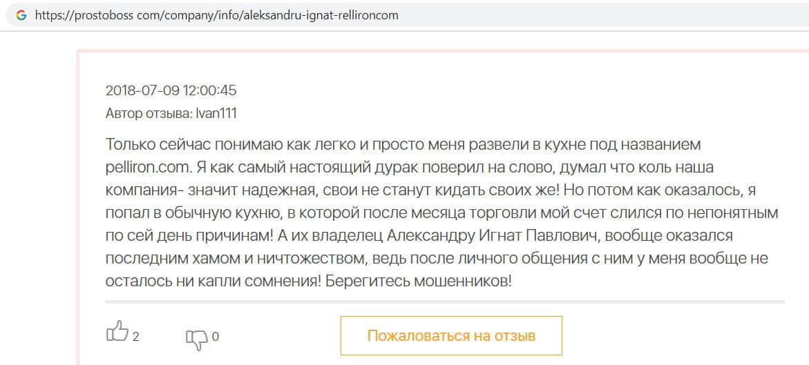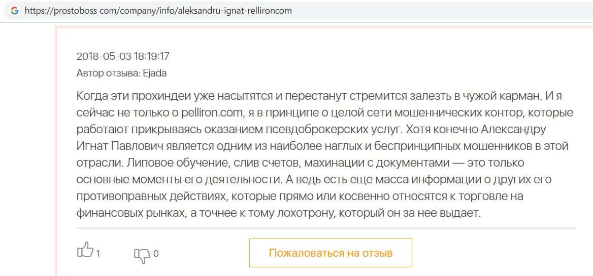 Автор данного отзыва попался на удочку аферистов брокерской организации Pelliron и закинул туда 10 000 долларов. К нему втерся в доверие главный аферист Александру Игнат, который убедил его в надежности вклада. Человек долго копил эти деньги, для него это теперь большая утрата. Он пытался вернуть деньги, но аферисты избегают кинутого клиента и получают удовольствие, когда страдают другие.