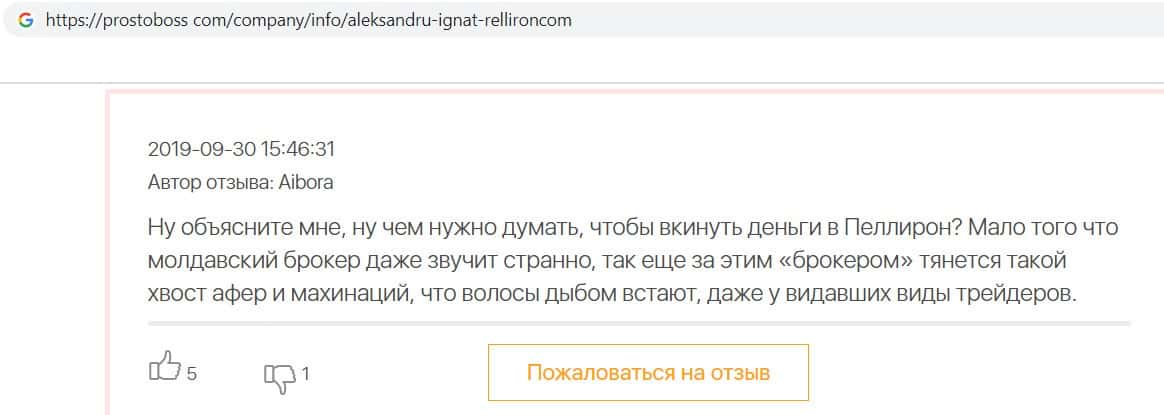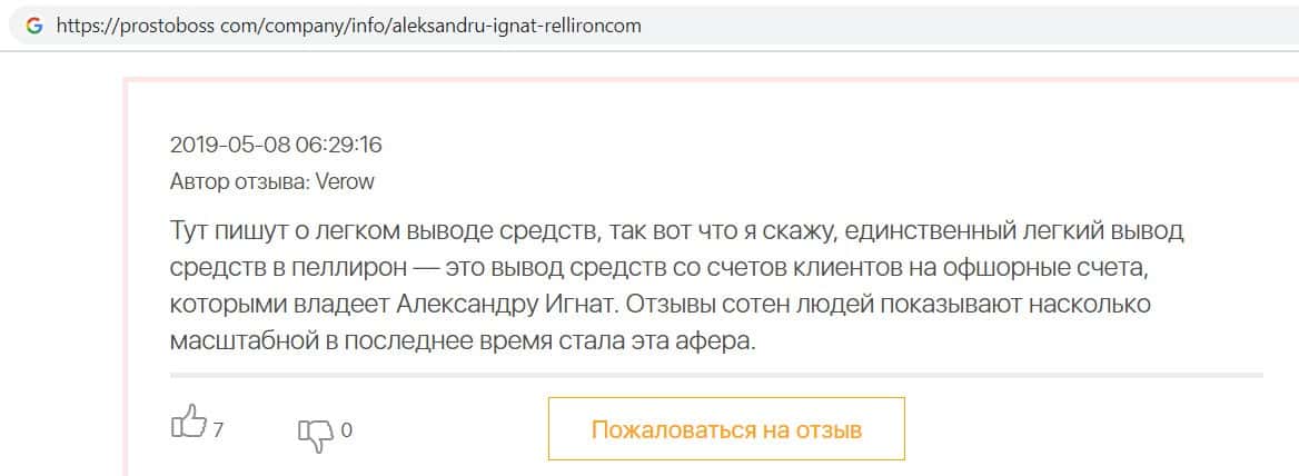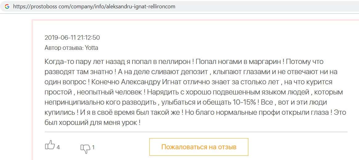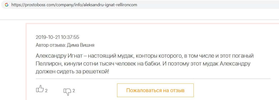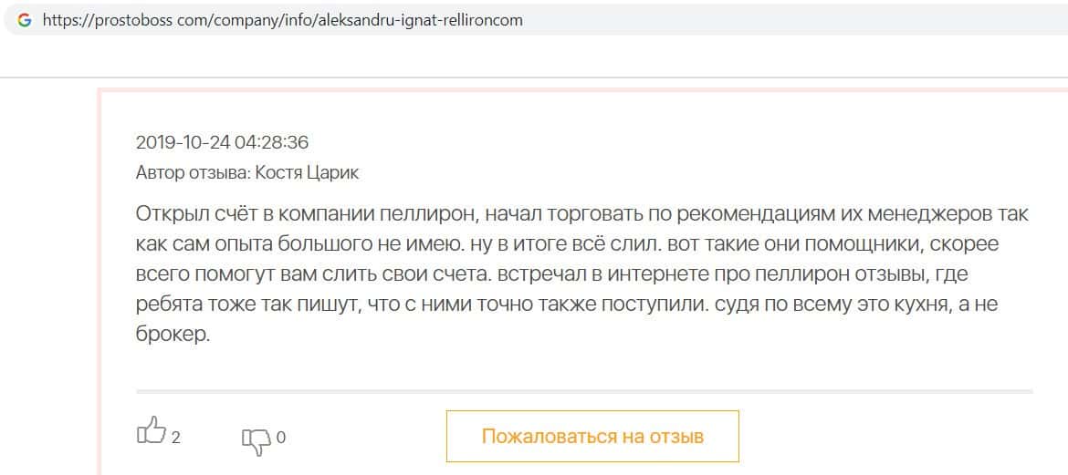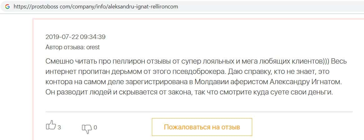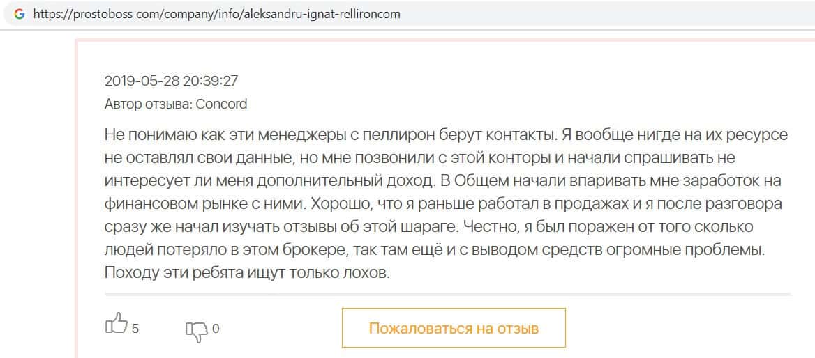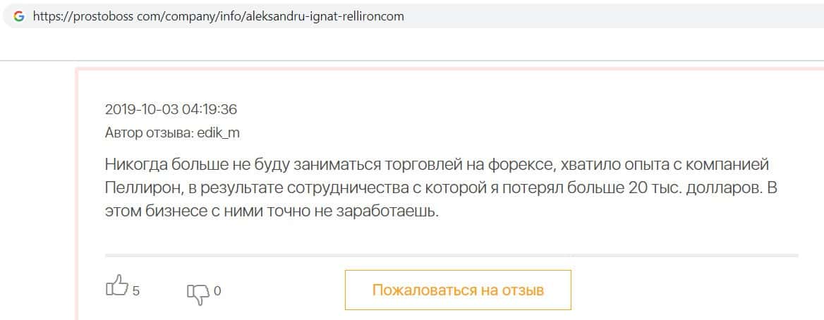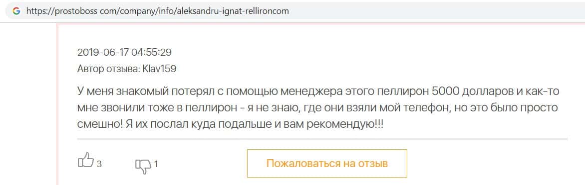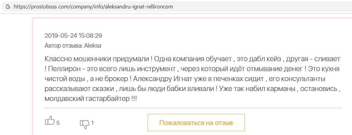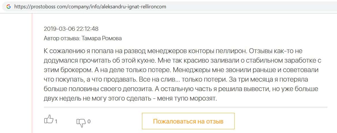 Автор данного отзыва попался на удочку аферистов брокерской организации Pelliron и закинул туда 10 000 долларов. К нему втерся в доверие главный аферист Александру Игнат, который убедил его в надежности вклада. Человек долго копил эти деньги, для него это теперь большая утрата. Он пытался вернуть деньги, но аферисты избегают кинутого клиента и получают удовольствие, когда страдают другие.