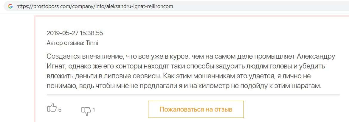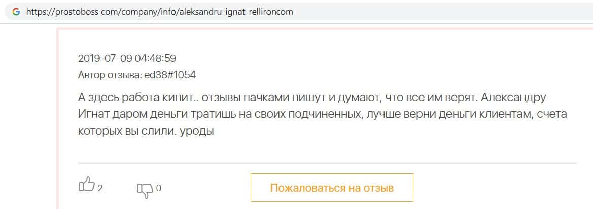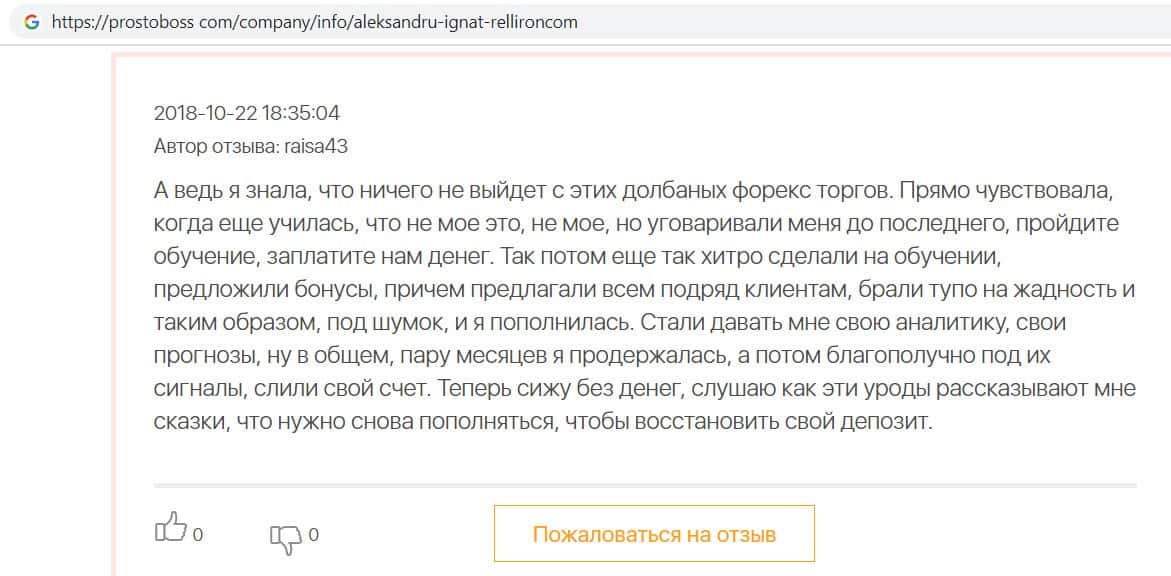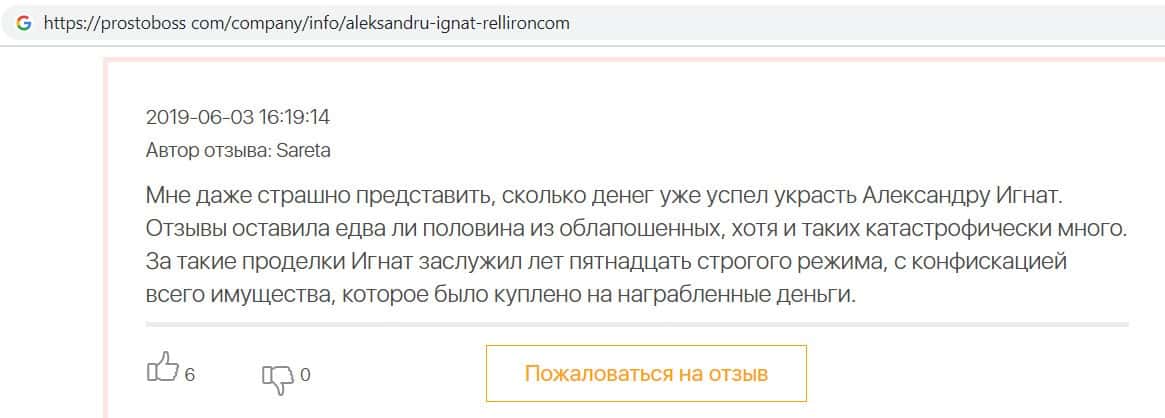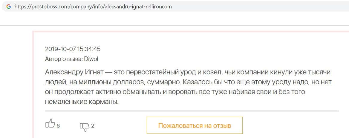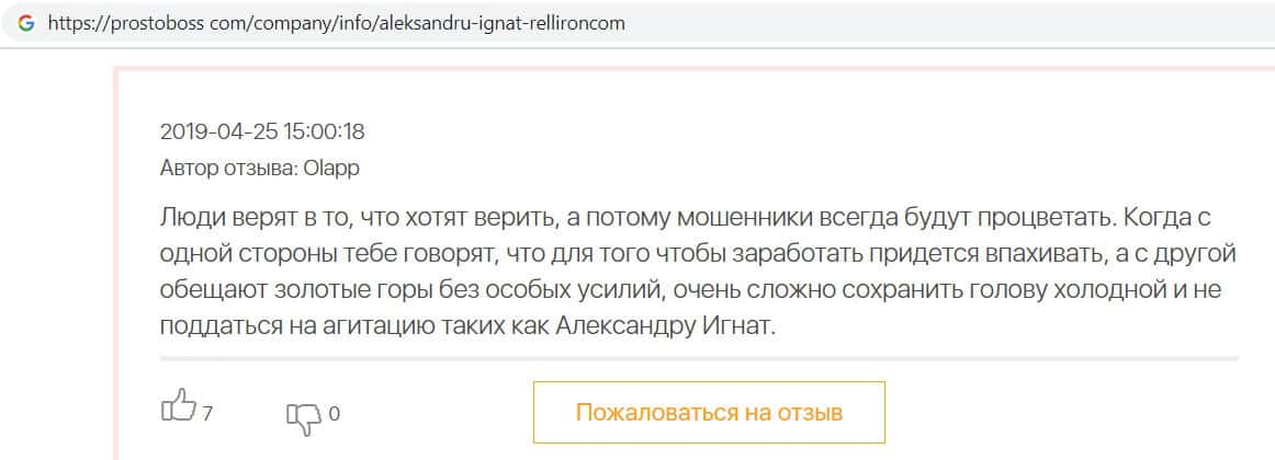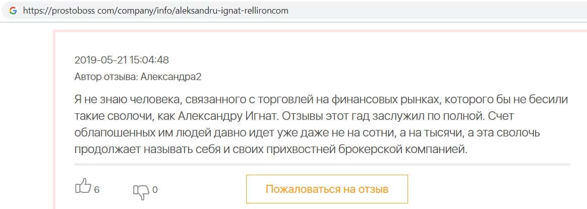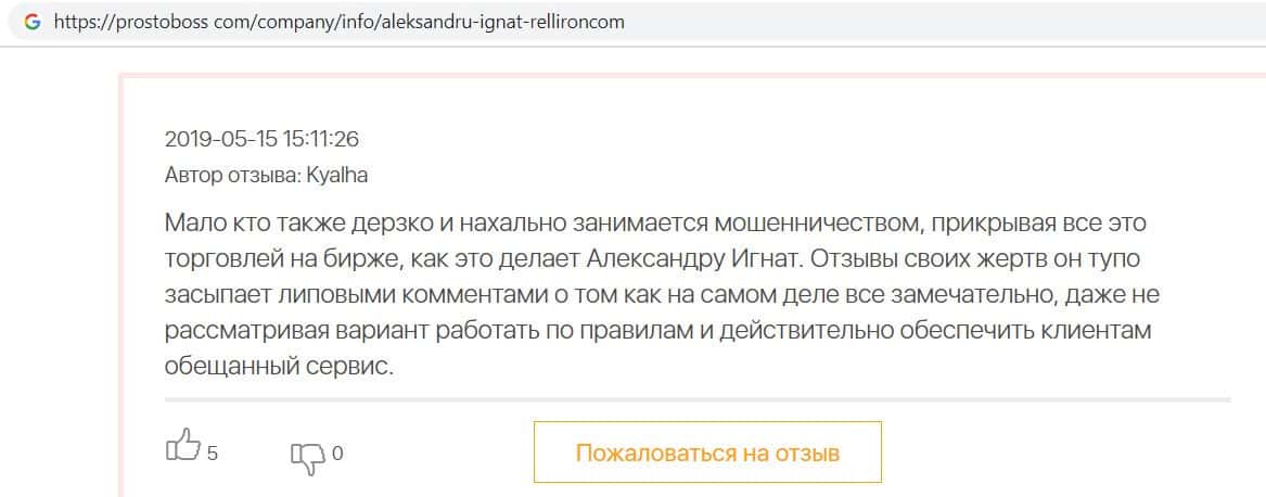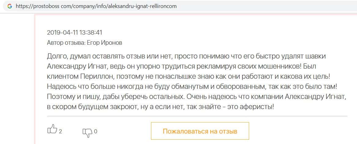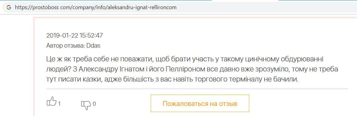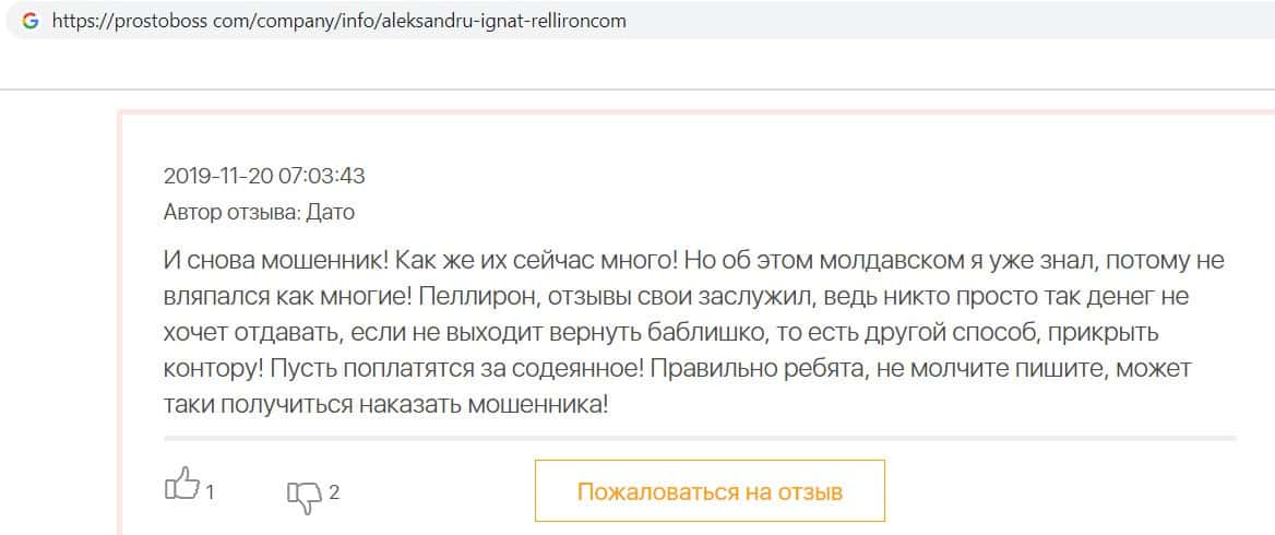 Автор данного отзыва попался на удочку аферистов брокерской организации Pelliron и закинул туда 10 000 долларов. К нему втерся в доверие главный аферист Александру Игнат, который убедил его в надежности вклада. Человек долго копил эти деньги, для него это теперь большая утрата. Он пытался вернуть деньги, но аферисты избегают кинутого клиента и получают удовольствие, когда страдают другие.