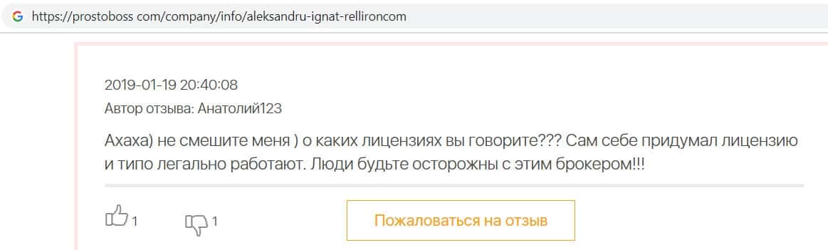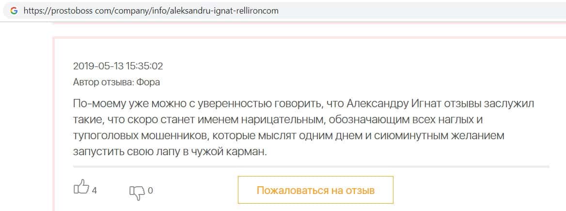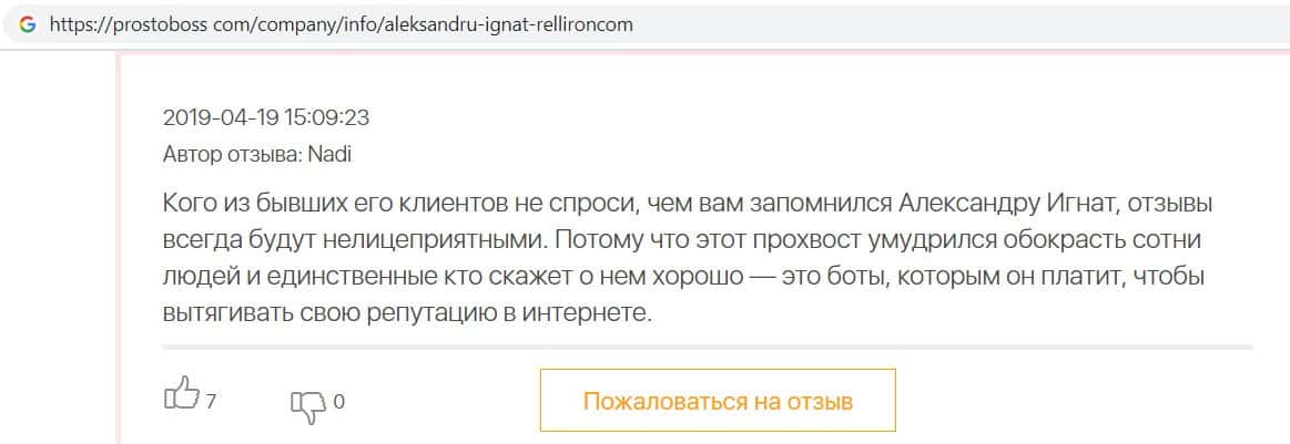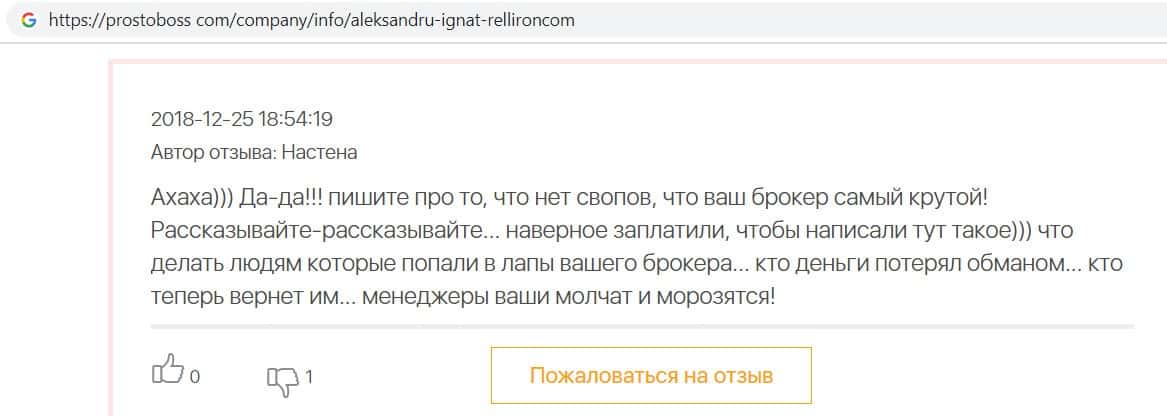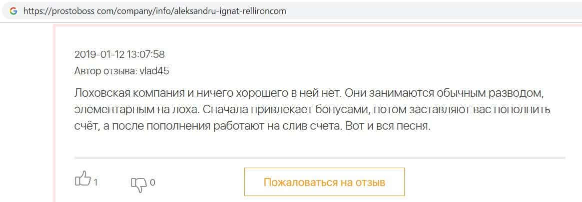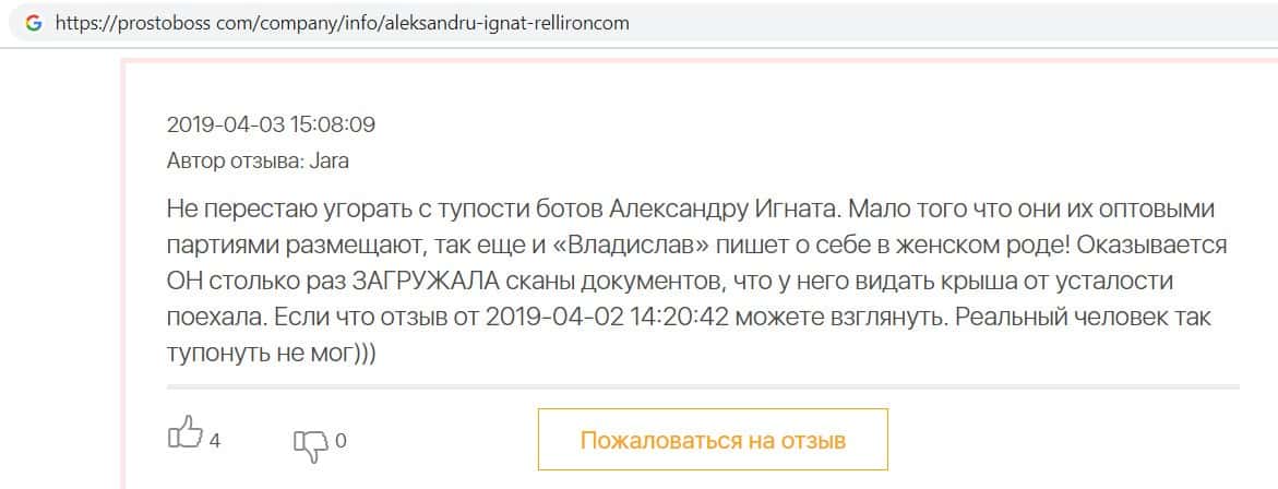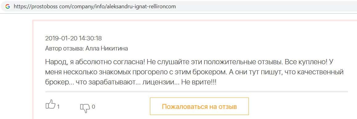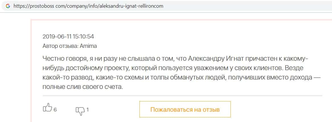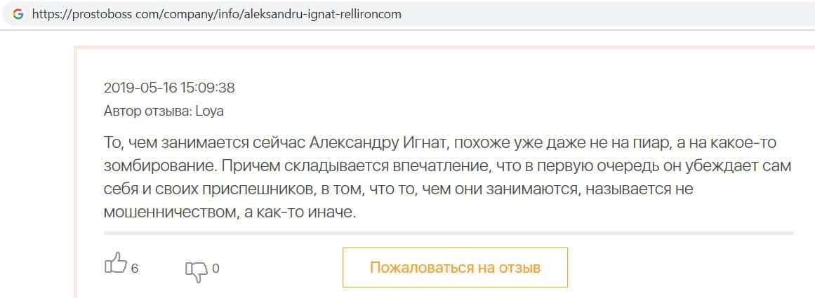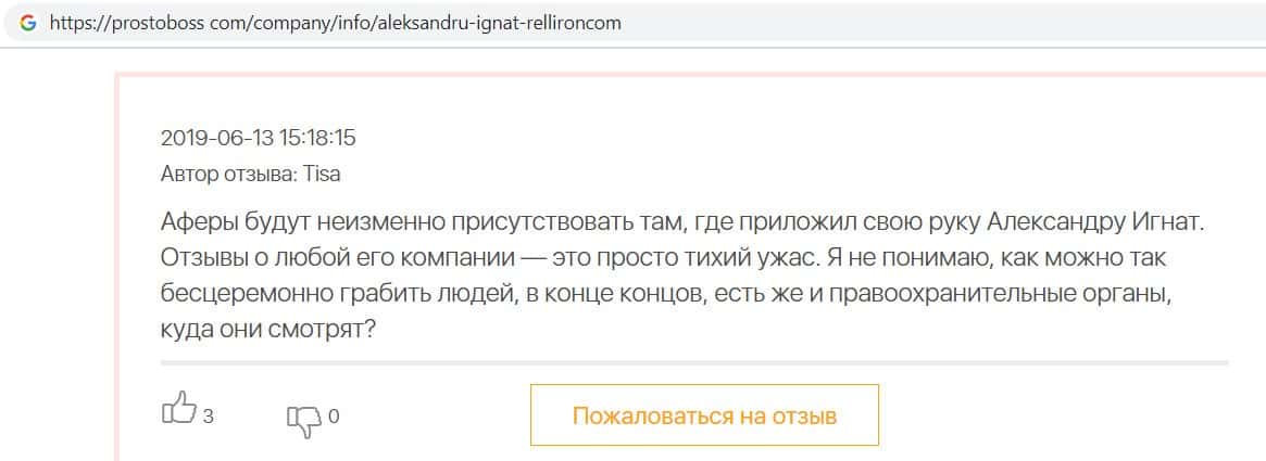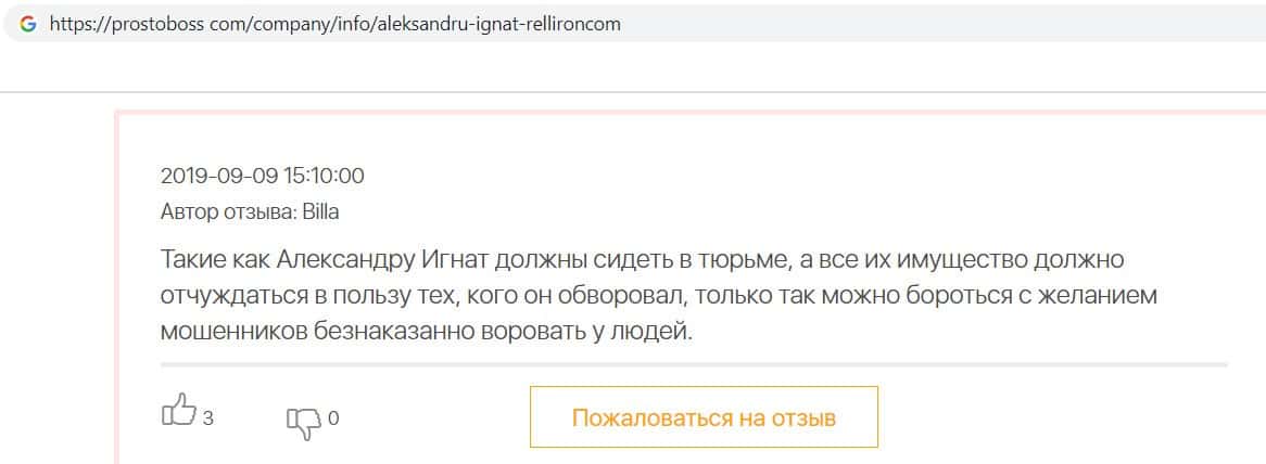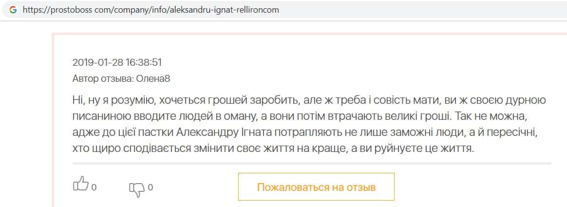 Автор данного отзыва попался на удочку аферистов брокерской организации Pelliron и закинул туда 10 000 долларов. К нему втерся в доверие главный аферист Александру Игнат, который убедил его в надежности вклада. Человек долго копил эти деньги, для него это теперь большая утрата. Он пытался вернуть деньги, но аферисты избегают кинутого клиента и получают удовольствие, когда страдают другие.