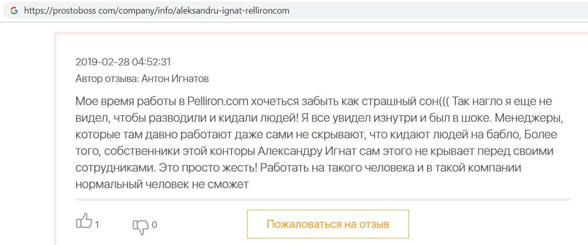 Пользователь написал, что компания Pelliron это мошенники, которые разводят клиентов, а те кто сотрудничают с фирмой должны уйти из неё, так как своих денег они больше не увидят.
