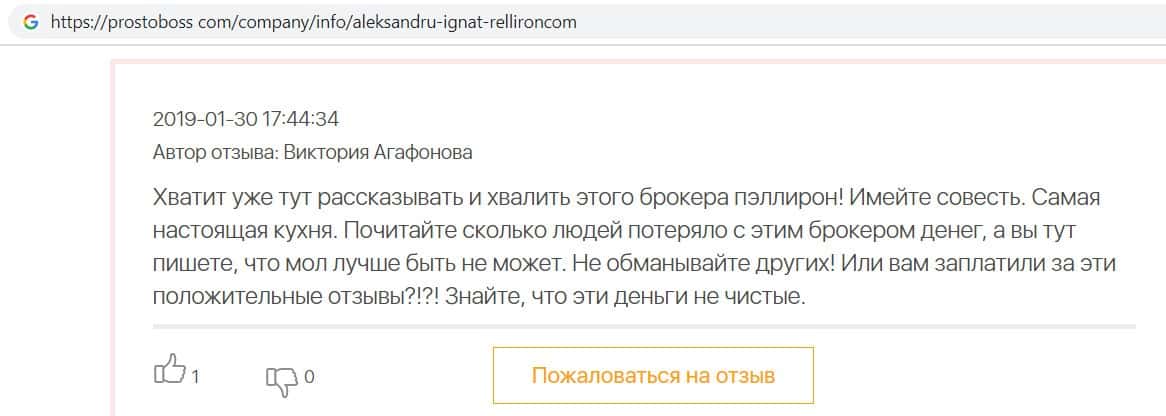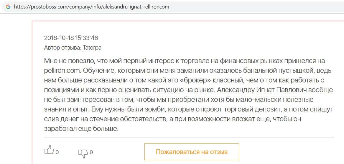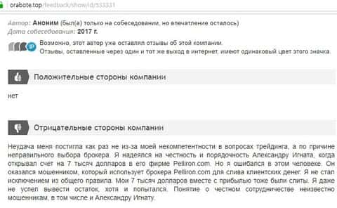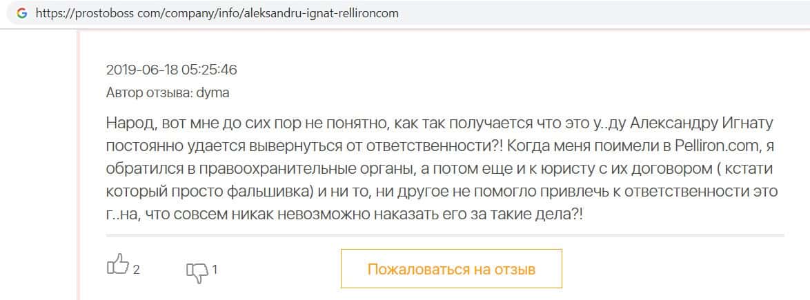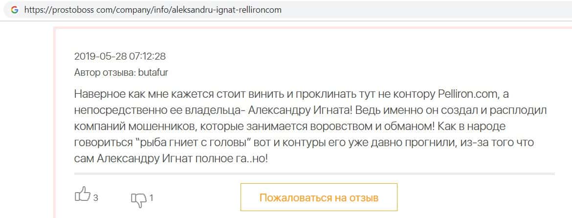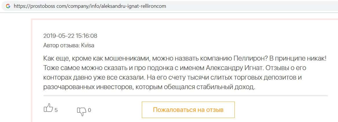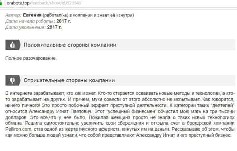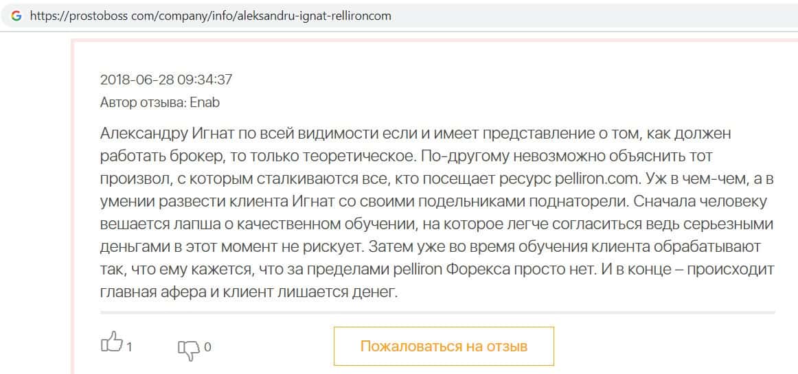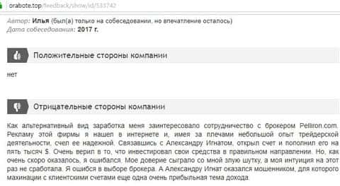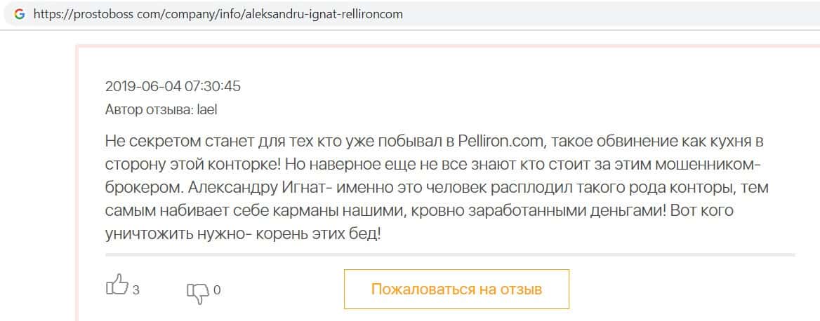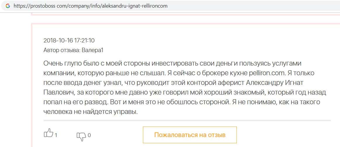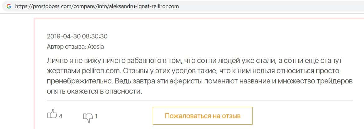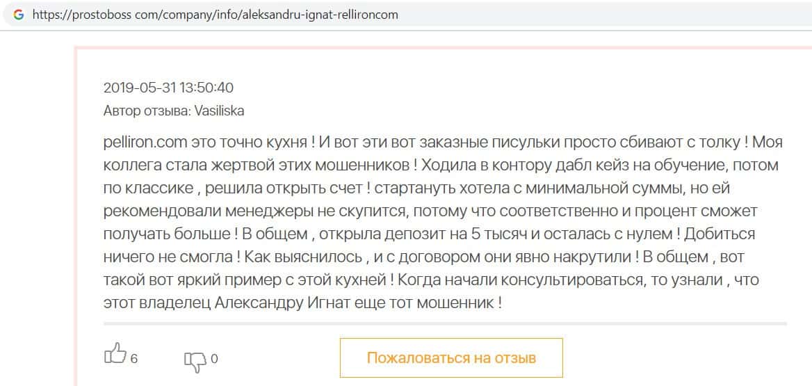 Мошенники форекс-кухни Пеллирон настолько много кинули людей, что в интернет-сети нет пустого места для отзыва. Главной отличительной особенностью является то, что у конторы есть главный человек-зло Александру Игнат Павлович. Он строгий и неадекватный, злой и наглый, штрафует за просто так, орет, хамит и угрожает. Мошенник очень много кинул людей и не только работая в этой конторе. Вообще если вам позвонили из кухни Pelliron или вы услышали о мошеннике Игнате немедленно бросайте трубку и бегите как можно скорее.