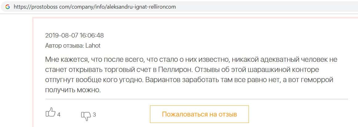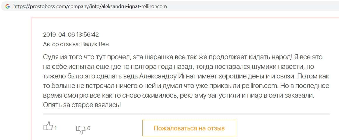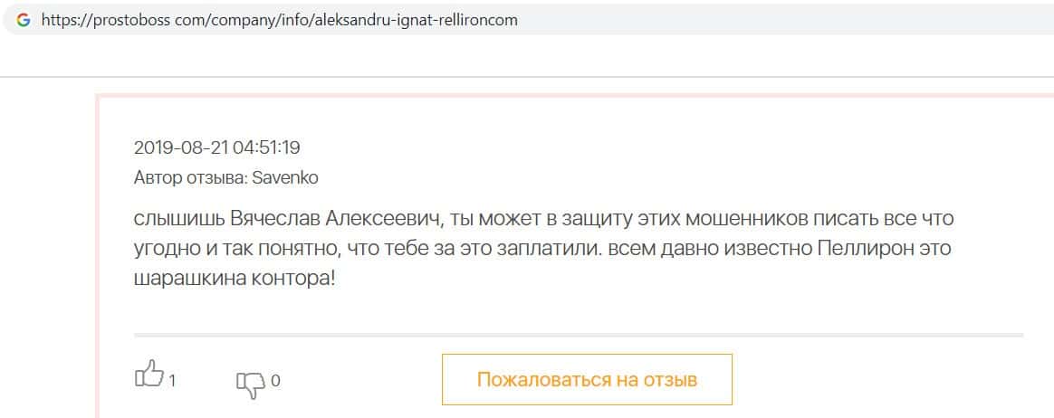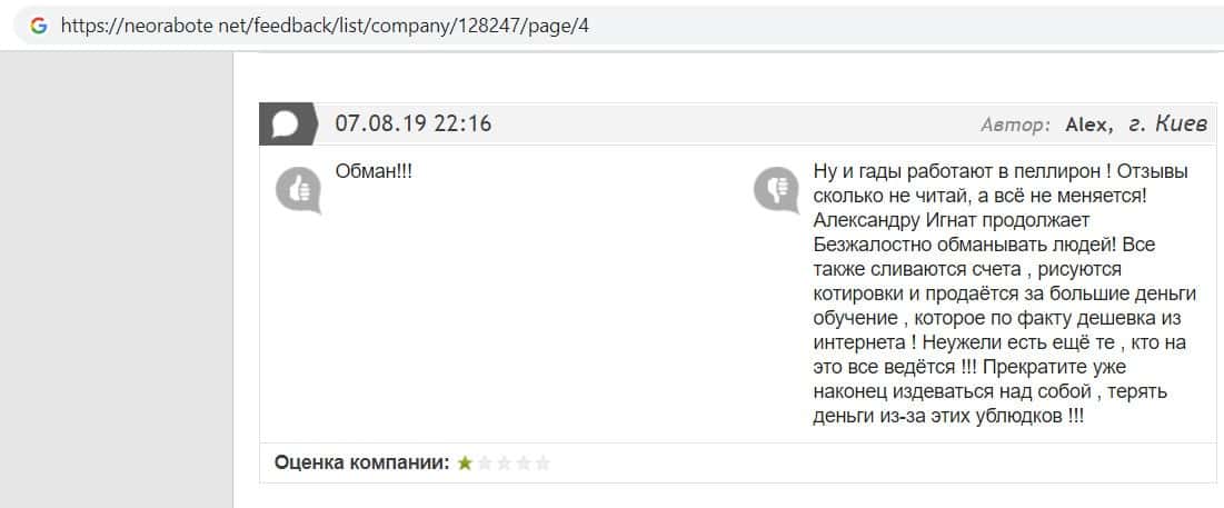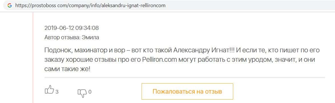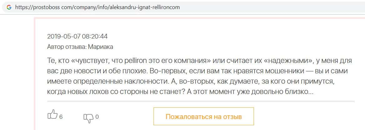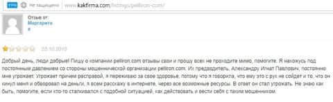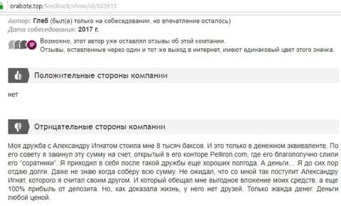 - Пользователь отговаривает всех сотрудничать с фирмой Пеллирон