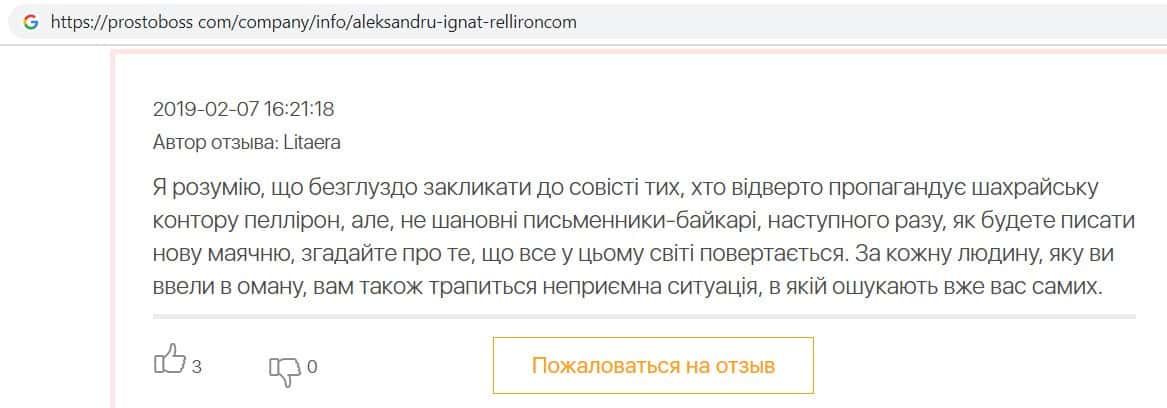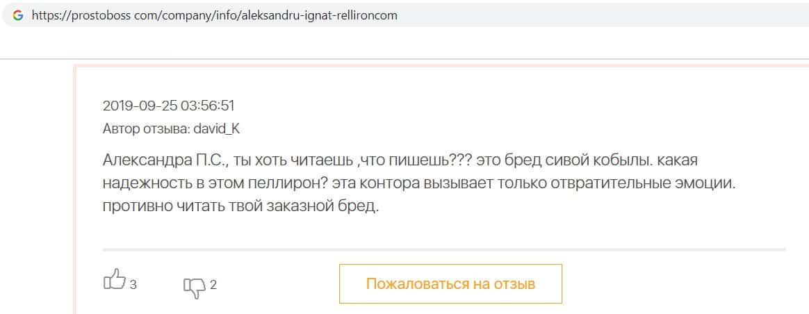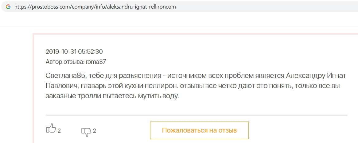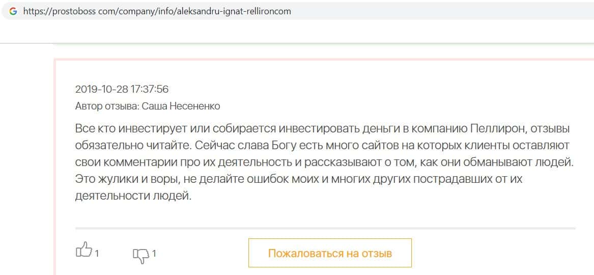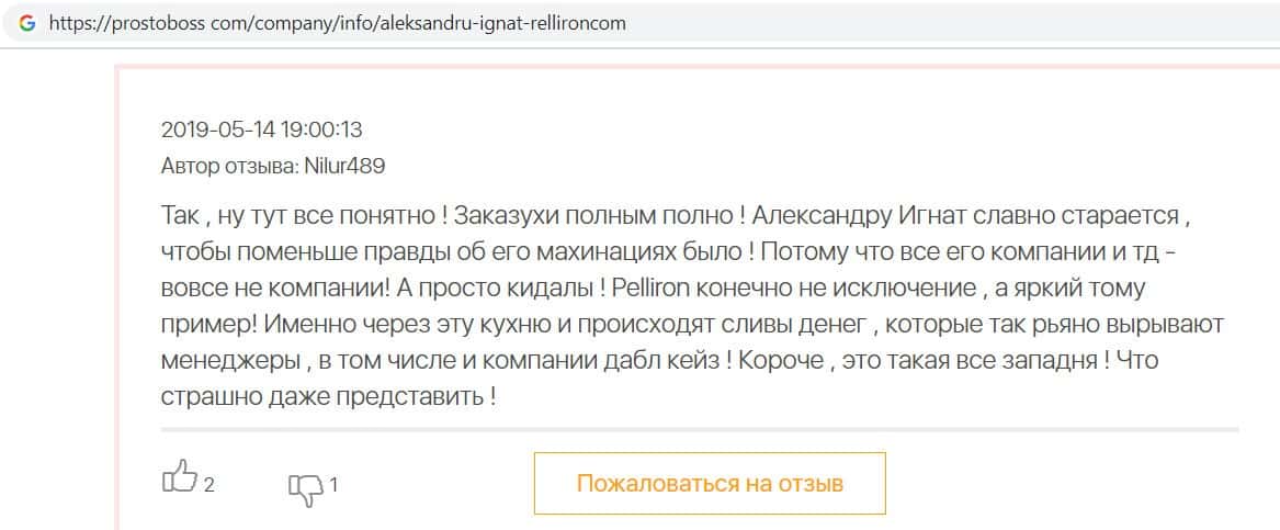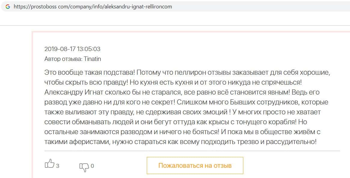 - Пользователь отговаривает всех сотрудничать с фирмой Пеллирон