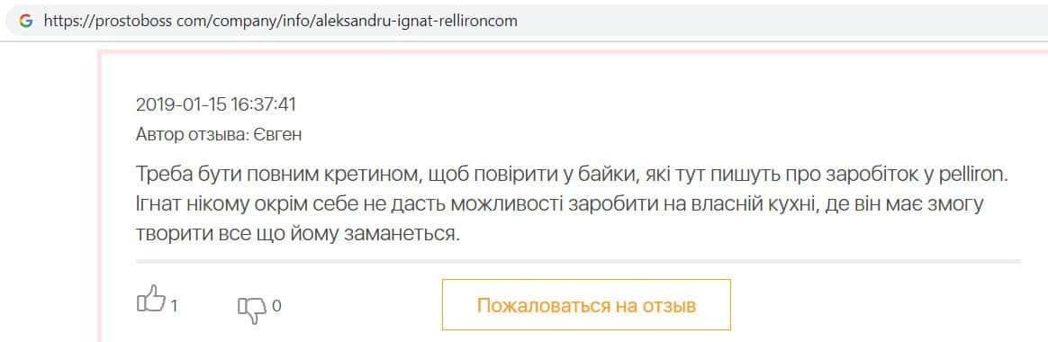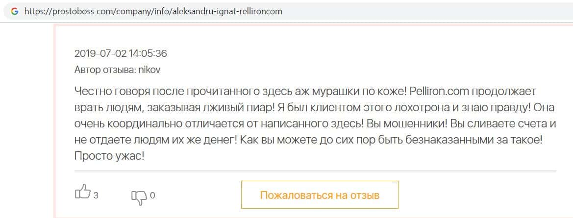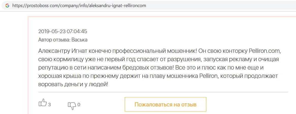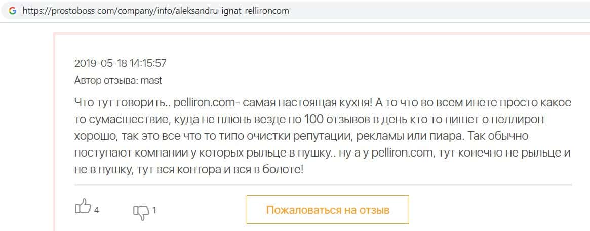 В очередном отзыве о компании разводил Pelliron пользователь написал, что своими фальшивыми отзывами компания просто вешает лапшу на уши клиентов и врёт им.