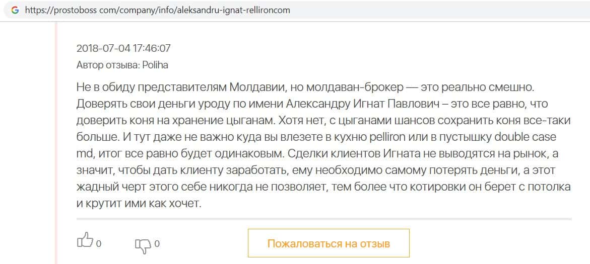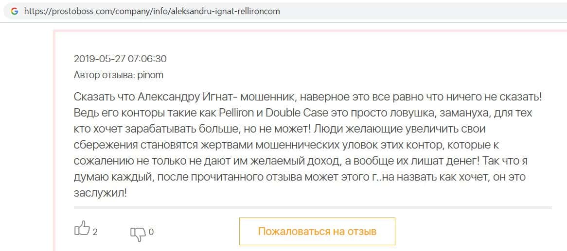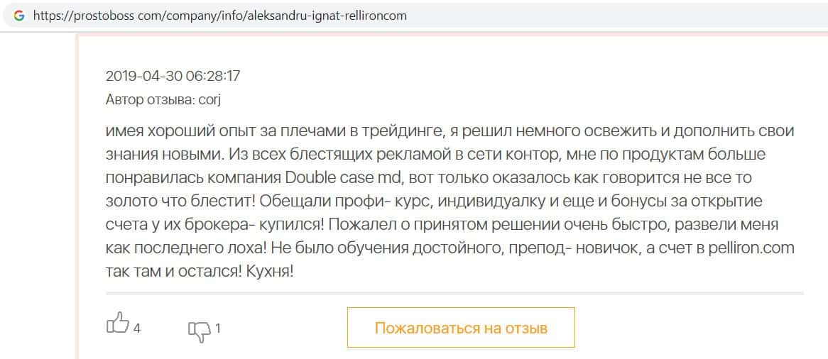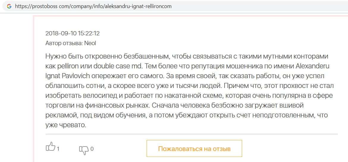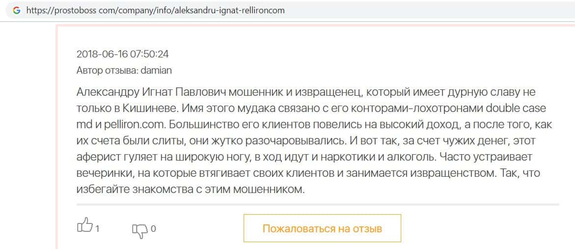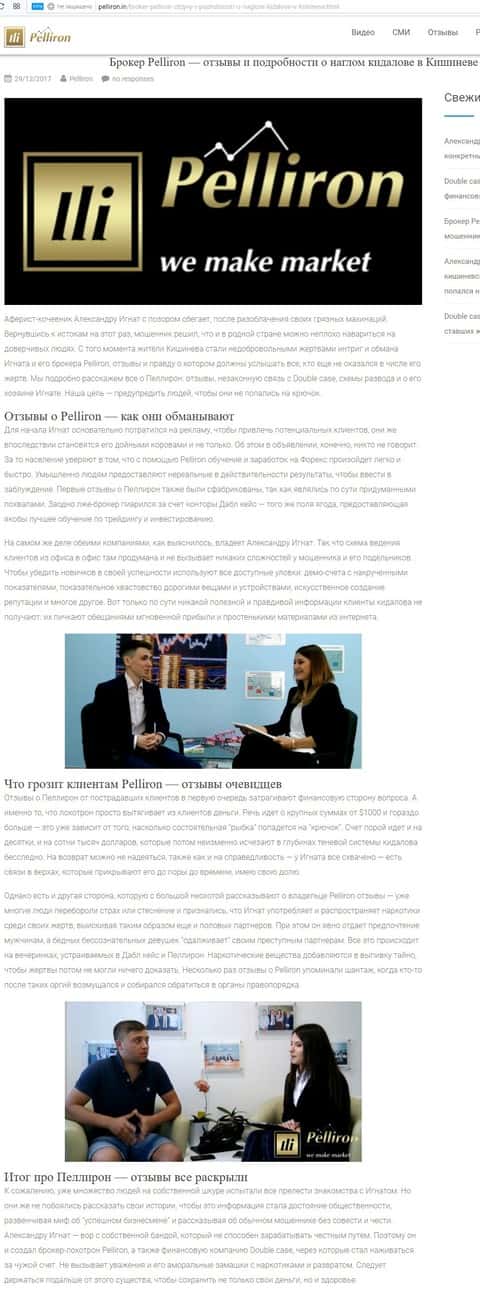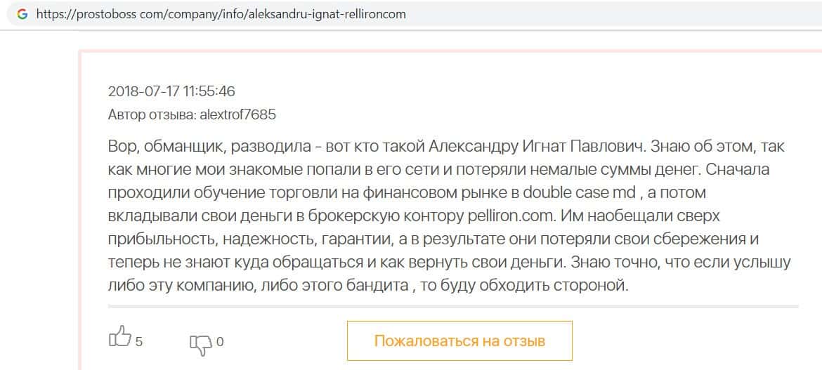 На сайте про воровские дела брокера Пеллирон pelliron in, размещена одна интересная статья о том как главный мошенник Александру Игнат вел мошенническую деятельность у себя на родине в Кишиневе. Вся аферистическая деятельность завязана на 2-х брокерах Пеллирон и Double Case, где главным является Игнат. Он поставил упор на рекламу и привлечение клиентов обучением, а главная задача это накормить завтраками и обещаниями своих клиентов, а потом конкретно ободрать. Жуть которую рассказывают об Игнате, просто не укладывается в голове. Помимо того, что он обворовывает людей, так еще и ищет сексуальных партнеров, в особенности мужчин, а бедных девушек предлагает своим бандитам-друзьям для утех. Вся эта вакханалия происходит на вечеринках, которые он устраивает. Поэтому настоятельно советуем не связываться ни с Пеллирон, ни с Дабл Кейс, все приведет к горю и разочарованию.