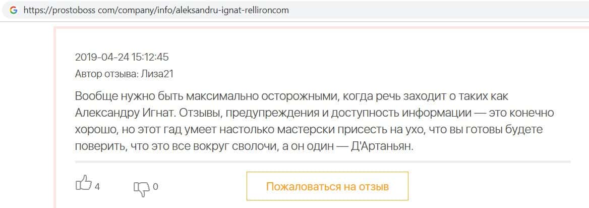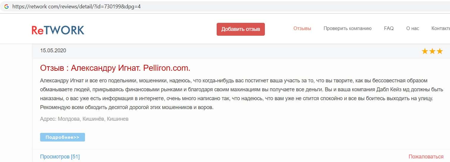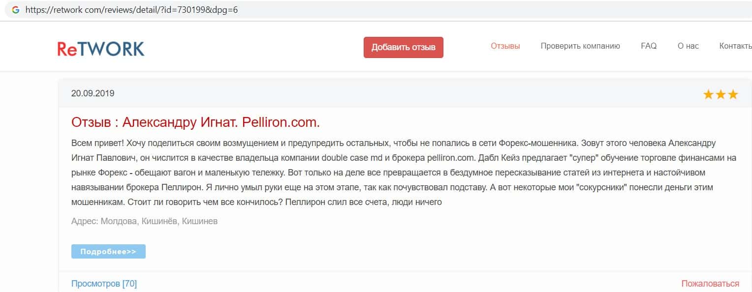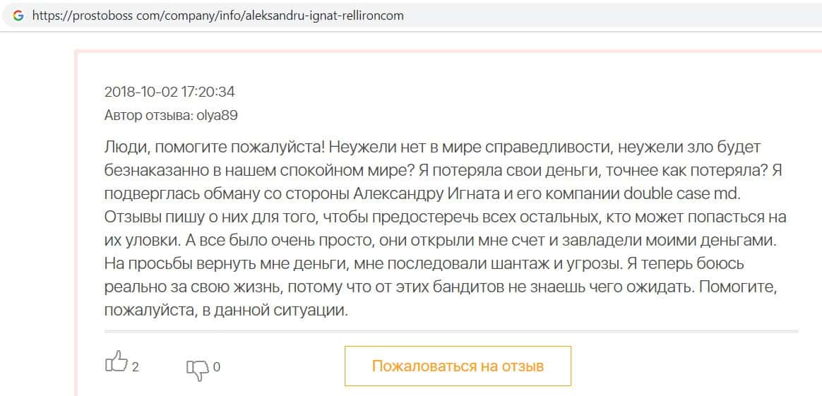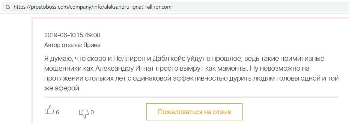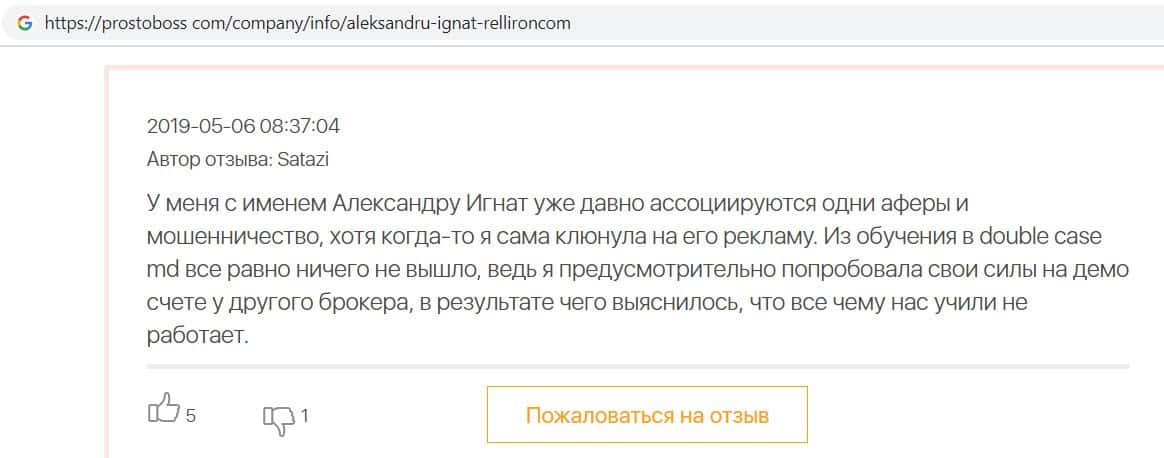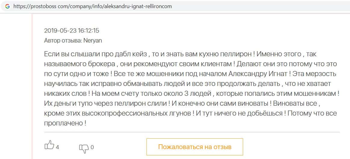 На сайте про воровские дела брокера Пеллирон pelliron in, размещена одна интересная статья о том как главный мошенник Александру Игнат вел мошенническую деятельность у себя на родине в Кишиневе. Вся аферистическая деятельность завязана на 2-х брокерах Пеллирон и Double Case, где главным является Игнат. Он поставил упор на рекламу и привлечение клиентов обучением, а главная задача это накормить завтраками и обещаниями своих клиентов, а потом конкретно ободрать. Жуть которую рассказывают об Игнате, просто не укладывается в голове. Помимо того, что он обворовывает людей, так еще и ищет сексуальных партнеров, в особенности мужчин, а бедных девушек предлагает своим бандитам-друзьям для утех. Вся эта вакханалия происходит на вечеринках, которые он устраивает. Поэтому настоятельно советуем не связываться ни с Пеллирон, ни с Дабл Кейс, все приведет к горю и разочарованию.