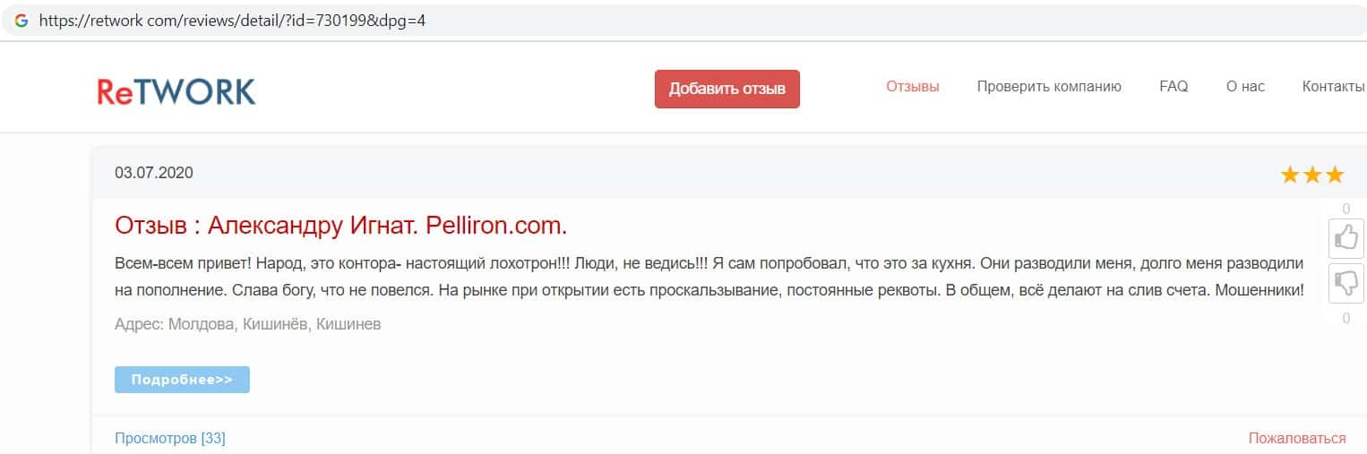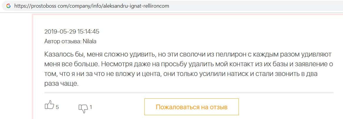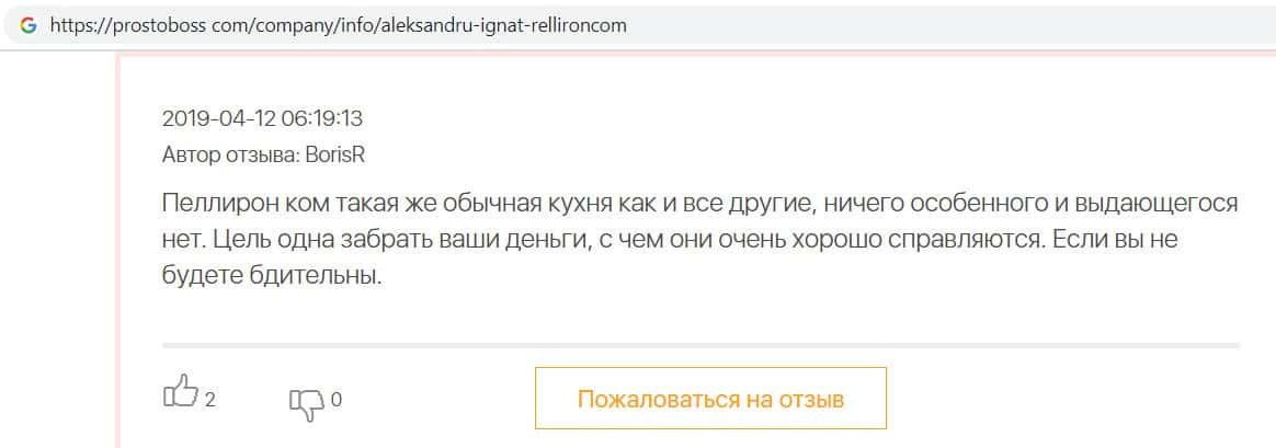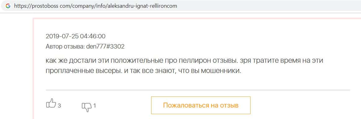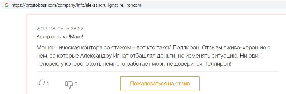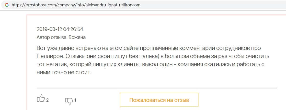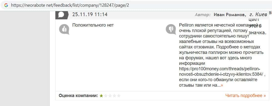 Пользователь написал отзыв, после того как заметил, что на одном из интернет ресурсов появились хвалебные отзывы о разводилах Пеллирон, так как компания заплатила сайту.
