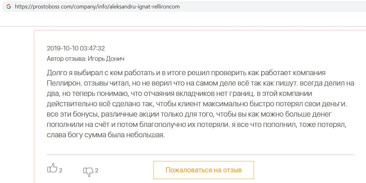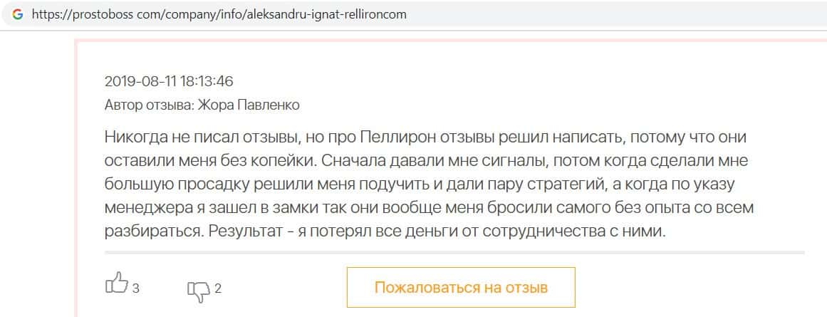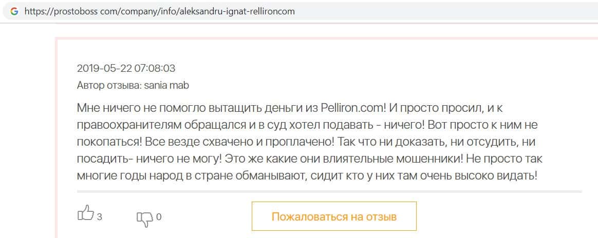 В данном отзыве пользователь сообщил. что от рук махинаторов Pelliron пострадали сотни пользователей, так как поверили в фальшивые обещания и отзывы конторы кидал.