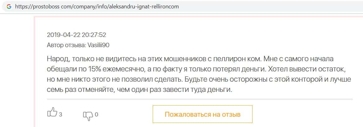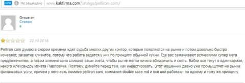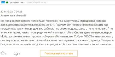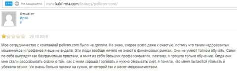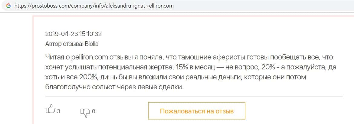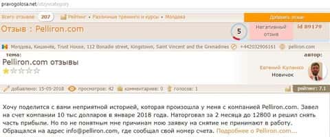 Автор отзыва написал, что фирма махинаторов Pelliron обещала ему 15 процентов ежемесячной прибыли, в итоге ничего не заплатила и не позволила вывести остаток средств.