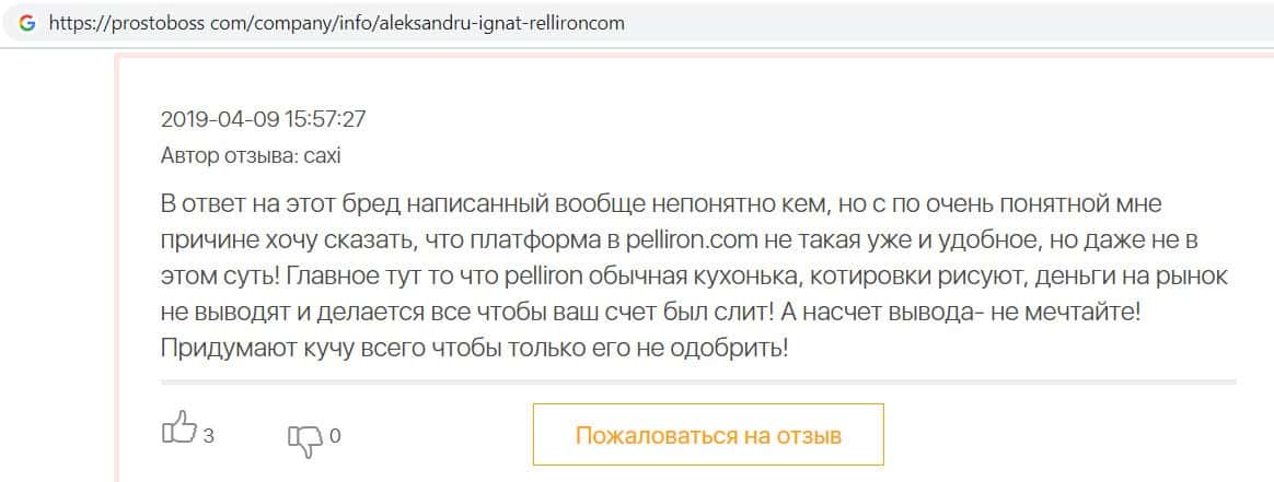 Пользователь сообщил, что его бесит то, что Pelliron хочет завладеть всеми деньгами, до которых дотянется, а так же считает своих клиентов идиотами, которых можно кинуть.