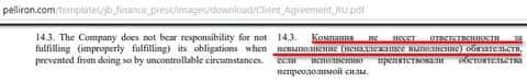 Согласно Клиентскому соглашению предоставленному компанией Пеллирон, мошенники отказываются от ответственности за невыполнения обязательств, если исполнению препятствовали обстоятельства непреодолимой силы. То есть в данный пункт можно приписать любой казус, за который они не будут нести ответственность, так как "обстоятельства непреодолимой силы" для каждого различны и субъективны.