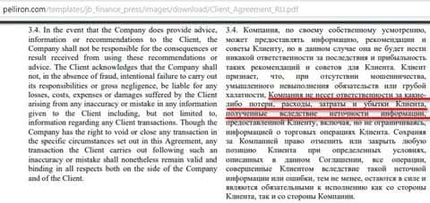 Мошенники также обезопасилии себя от ответственности за свою деятельность в случае, если клиент понесет какие-либо потери, расходы, затраты и убытки в случае использовании информации, которую предоставила ему контора Pelliron. Таким образом мошенники не несут ответственность, если сольют ваш депозит.