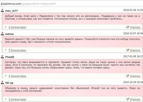На интернет-ресурсе плюсиминус ком - нет даже живого места где не было написано о брокерской конторе Пепперстон. Люди просто удивляются, как такой брокер, мог оказаться аферистом и шарлатаном. Помимо того, что для слива депозитов они используют кухонные методы, так еще и замораживают счета и не желают выводить средства клиентов. Так что если вы уже попали в контору Pepperstone немедленно выводите деньги, пока не поздно.