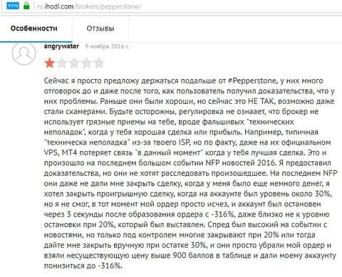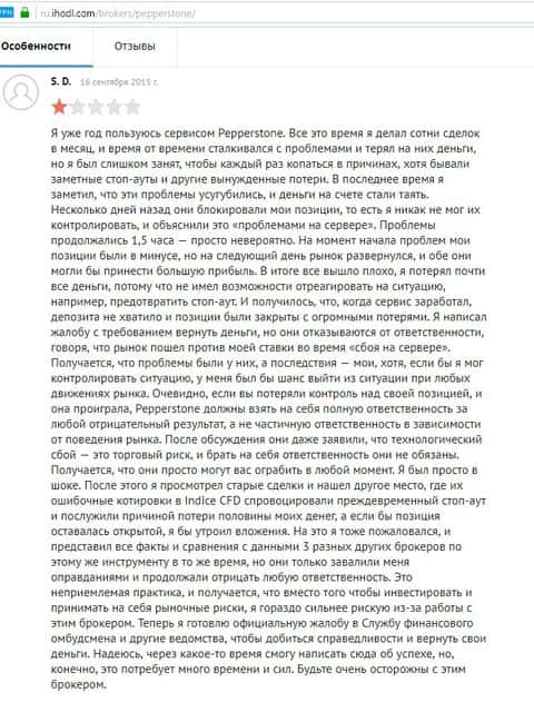 А вот следующий автор отзыва просто говорит, что нужно держаться подальше от аферистов Пепперстон. Бывший клиент рассказал, что до этого контора работала более и менее, а потом вообще стала вести себя как скам. Например был случай со сбоем торговой платформы и серверов и из-за этого нагрузка на счет увеличилась в разы. Ну и понятное дело, весь депозит отмаржинколило. Аферисты не ответили за свои косяки и деньги так и не вернули.