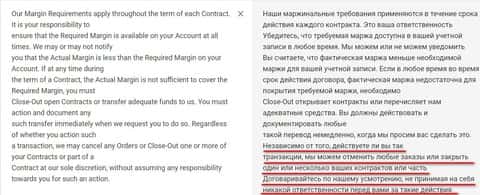 Учитывая информацию, которая описана в договоре между мошенниками Пепперстон и клиентом, можно выделить один раздел, который касается маржинальной торговли. Там есть один хитрый пункт в котором сказано, что если компания посчитает, что маржи на счету клиента недостаточно, то она вправе закрыть все сделки вне зависимости от из положения. А вот именно чем, кухня Pepperstone, будет руководствоваться при принятии такого решения, здесь не указано. Ну как обычно с потолка все решается.