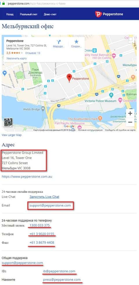 Контактов у мошенников Пепперстон намного больше чем предполагалось, так как аферисты имеют офисы в различных точках мира. Поэтому для удобства мы решили разбить контактные данные по блокам. Ниже представлены контакты Мельбурнского офиса в Австралии: