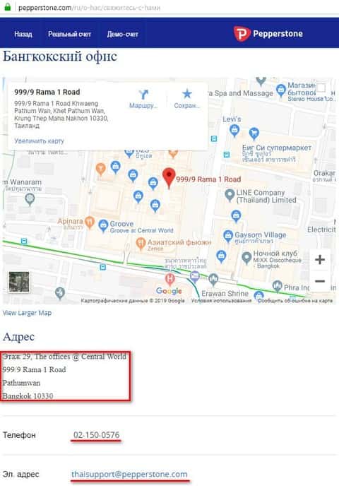 Ниже мы можем увидеть данные где размещен офис мошеннической компании Пепперстон в Бангкоке, это адрес, почта и номер телефона: