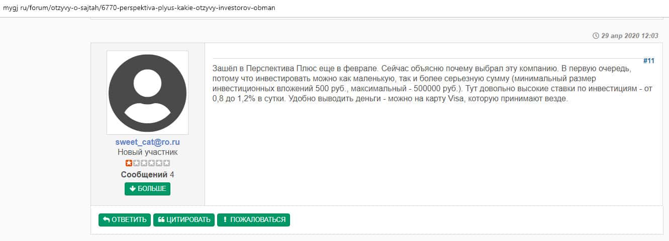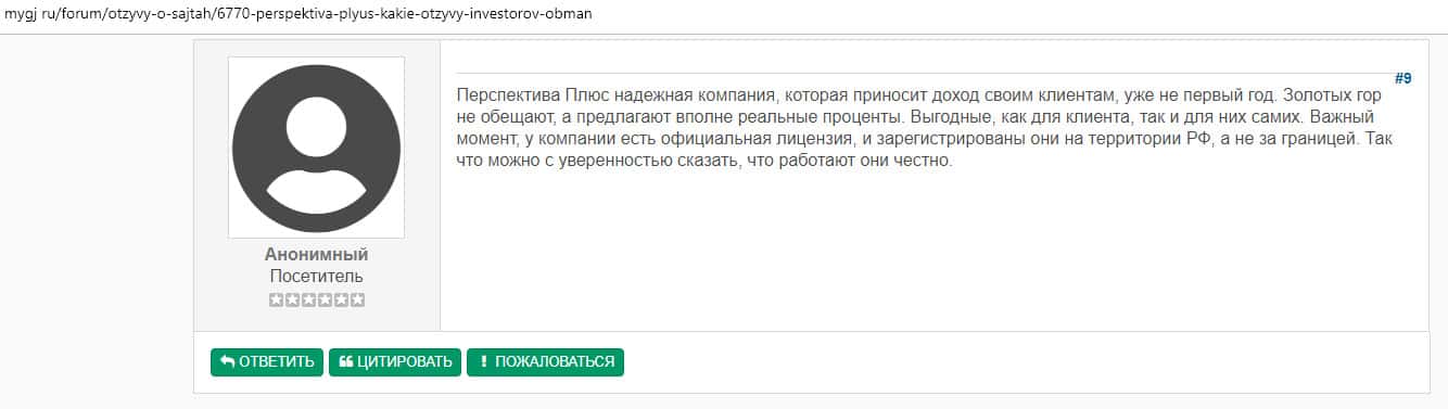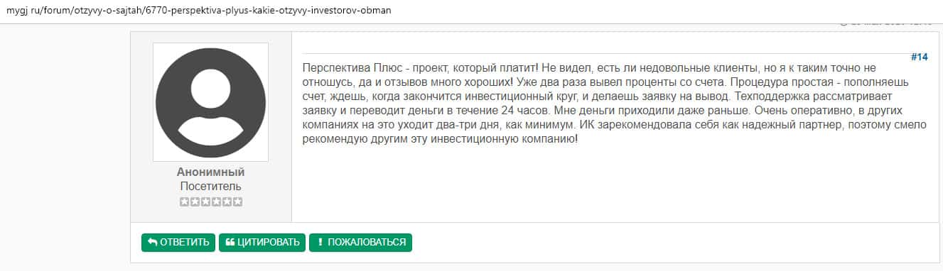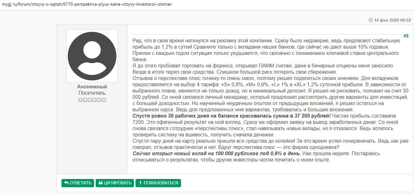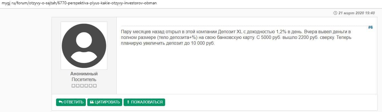 На том же форуме у одного пользователя анонимного промелькнула мысль, что Перспективе Плюс можно доверять, так как она предлагает вполне реальные, не большие и не маленькие, проценты. Большей глупости я ещё не слышал, когда от 1% в день стало не большой процентной ставкой, даже для всяких хайп-проектов. Не стоит лгать людям.