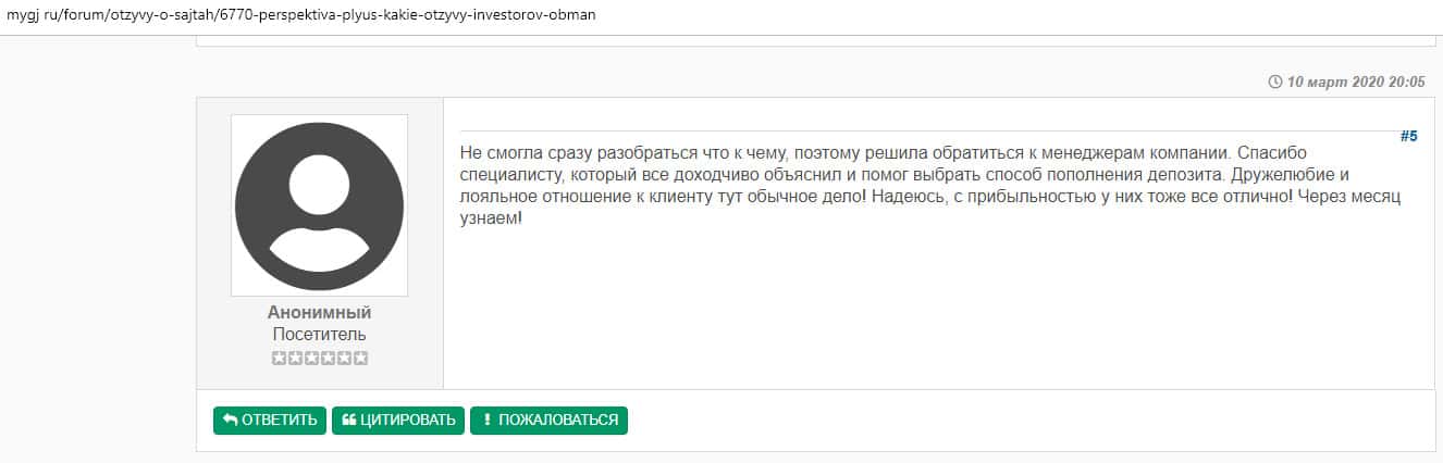 Ещё один краткий анонимный пользователь - клиент инвестиционной платформы Перспектива Плюс