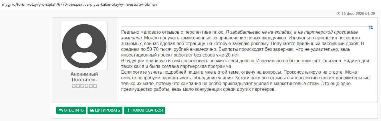 Ещё один отзыв от анонимного пользователя, удивлённого, что в интернете очень мало отзывов про Перспектива Плюс, который очень похож на отзыв бота. Мало отзывов в интернете, потому что негативные отзывы компания всеми силами стирает с интернета, а положительные никто не пишет, кроме подсобных рабочих и проплаченных пользователей интернета.