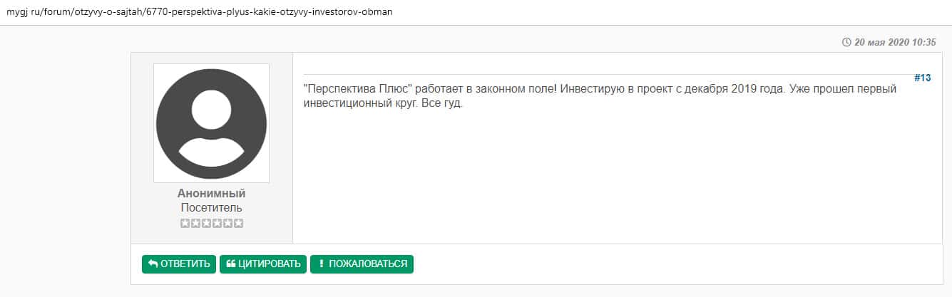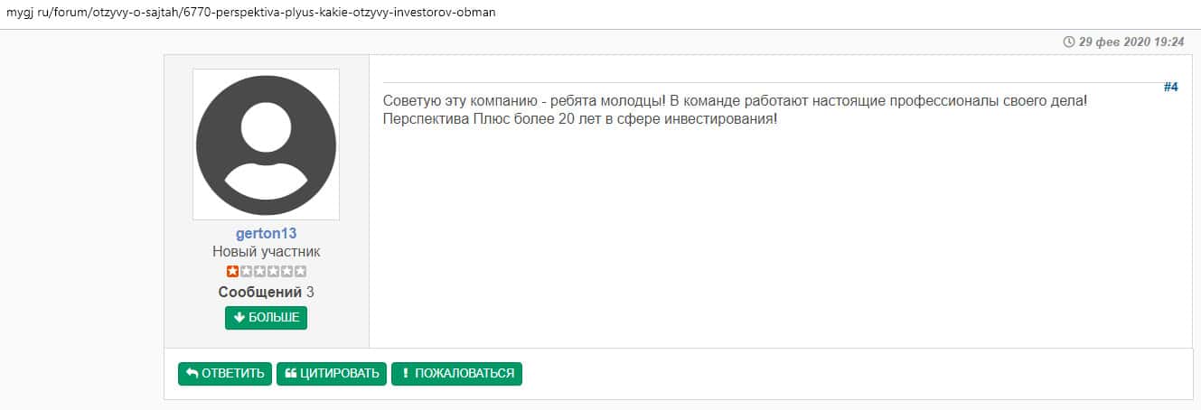 Стоит отметить, что на форуме есть один положительный отзыв о конторе Перспектива Плюс, который не смахивает на отзыв от бота, но при этом он от анонимного пользователя и написан про настоящую финансовую пирамиду, которая никак не может соответствовать его словам. Никогда не доверяйте никому на слова, стоит всё проверять и перепроверять.