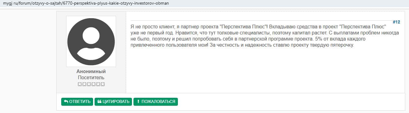 Ещё одна ложь от анонимного пользователя о работе мошеннической кухни Перспектива Плюс