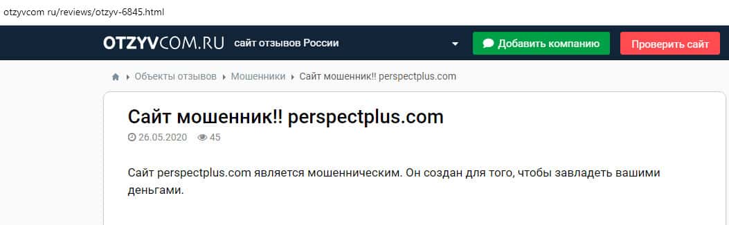 На сайте otzyvcom ru находится краткий негативный отзыв о Перспектива Плюс. Он довольно краток и сухой. Из-за краткости, глупый и наивный пользователь интернета подумает, что это проделки конкурентов этого лохотрона, и побегут вкладывать в этот ящик Пандоры. Не стоит при работе с инвестициями как-либо проявлять эмоции и позволять одержать им вверх над вами.