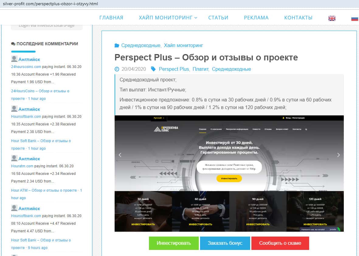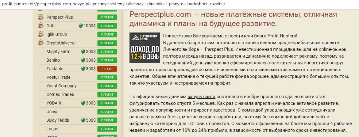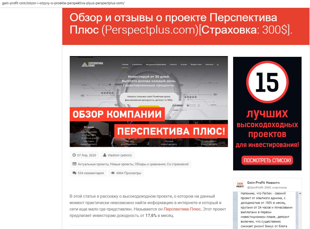 На сайте gain-profit com говорится о том, что Перспектива Плюс - это контора, которая предлагает очень большой процент для инвестирования и выполняет свои обязанности. О подтверждениях к этим словам ничего. Также внизу сделали множество отзывов от ботов, которые все, как один просто копируют друг у друга и выносят это, как подтверждение тому, что проект платит.