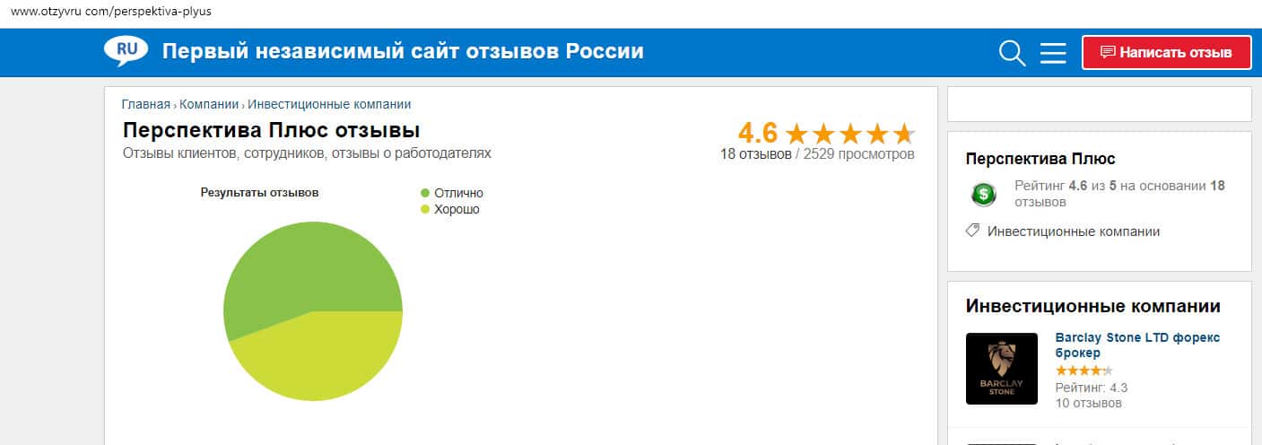 На сайте otzyvyru com у компании Перспектива Плюс средняя оценка 4,6 из 5. Стоит отметить, что это хайп-проект и всё не может быть так гладко, даже у самых заслуженных и честных хайп-проектов средняя оценка почти достигает 4,3 всего лишь, но никак не 4,6. Также много разных отзывов, которые написаны для каких-то глупцов в сфере инвестирования.