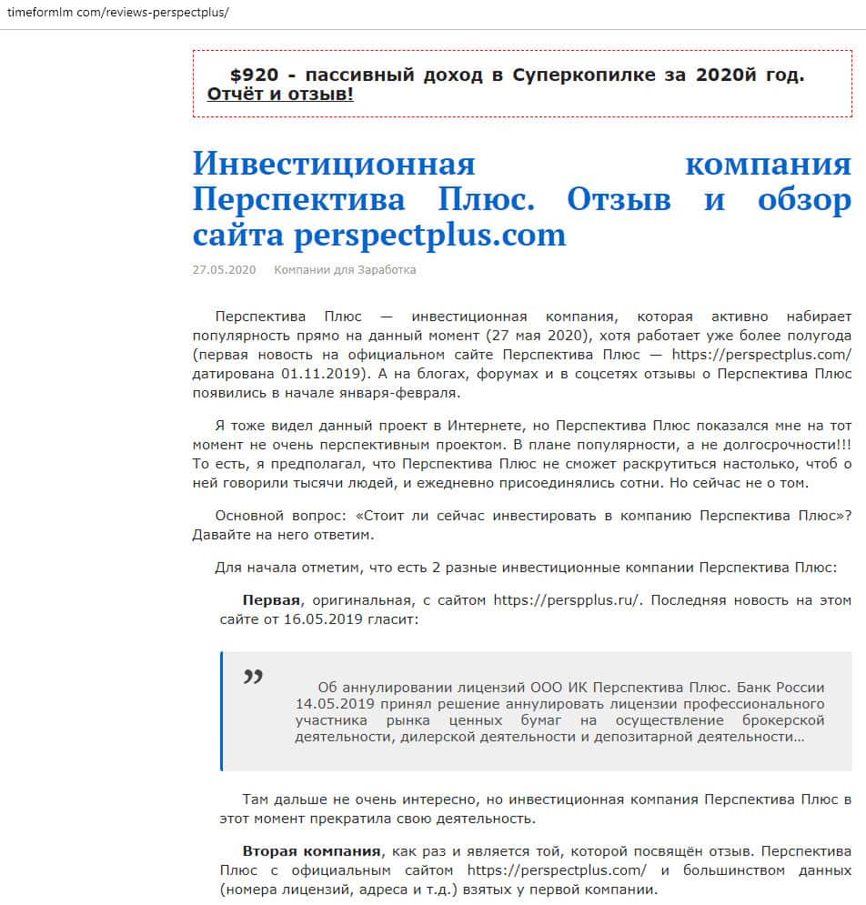 На сайте timeformlm com автор рассуждает о двух сайтах, которые якобы принадлежат конторе Перспектива Плюс - perspplus ru и perspectplus com. Автор говорит о том, что на обеих сайтах очень скудная информация о конторе, что говорит о плохом отношении к своим клиентам и возможной мошеннической деятельности, причём автор бы не стал вкладывать свои деньги.