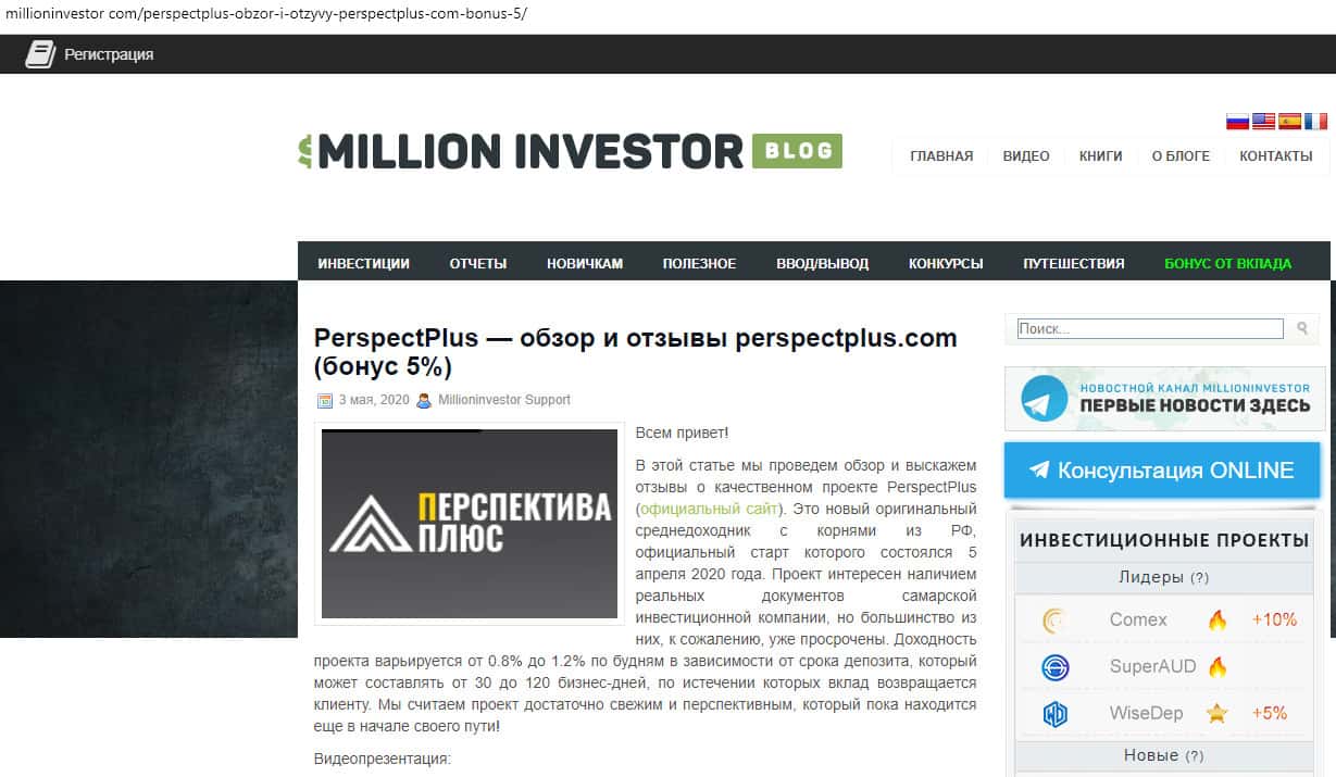 На millioninvestor com также большое количество льстящих слов в сторону мошеннической кухни Перспектива Плюс. Тут нам рассказывают о прибыльности, о том, что всё прозрачно и, что в случае каких-либо форс-мажоров нам отдадут наши деньги, только вот эти слова никакими пунктами из договоров Перспектива Плюс не подтверждаются, а всё это лишь на словах.