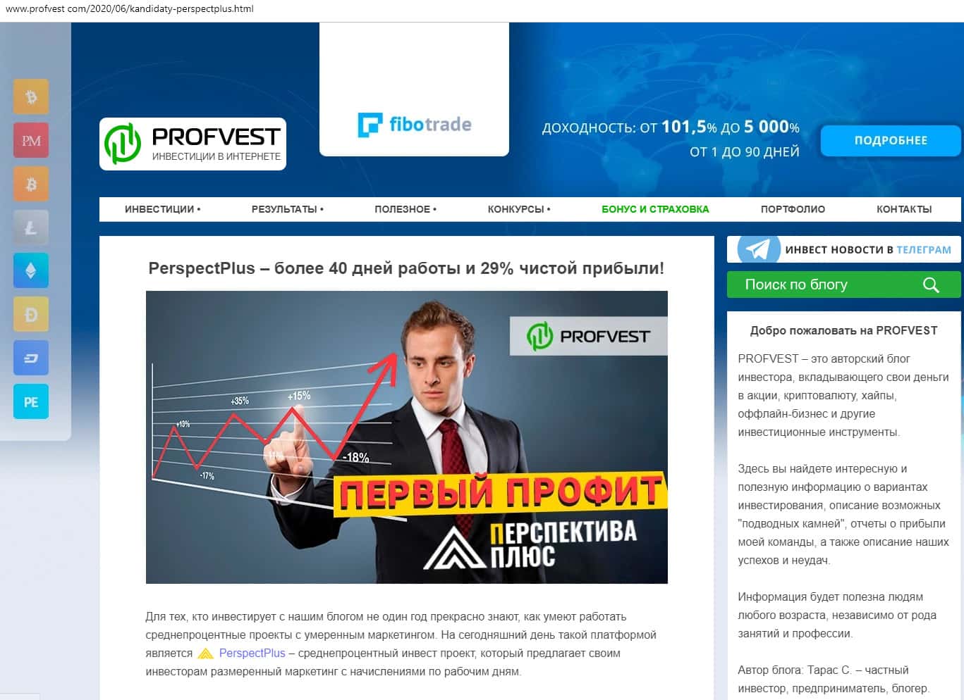 На сайте profvest com всеми силами пытаются заманить неопытных инвесторов в шарагу Перспектива Плюс, которая, как и любая другая финансовая пирамида, когда соберёт нужное, сверхогромное количество денег в своих руках, пришедших от наивных клиентов, соскамится и руководство её убежит на какие-либо острова, чтобы не понести уголовную ответственность.