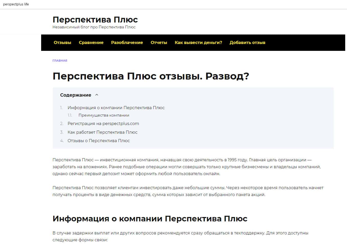 Перспектива Плюс создала свой "независимый" блог на сайте perspectplus life, в котором восхваляется работа данной шарашки и говорится о том, как повезло тем, кто уже вложил деньги в эту кухню и получил прибыль. Стоит отметить, что настоящий независимый блог не стал бы превозносить контору к божественному уровню без изъянов, ведь они всегда есть.